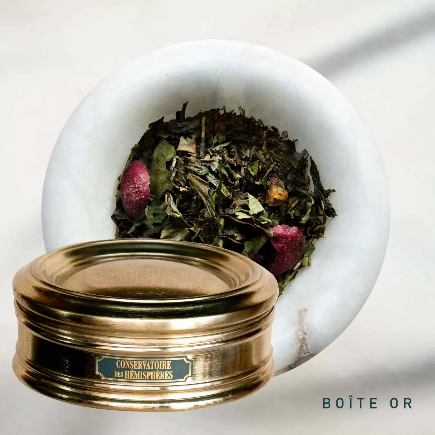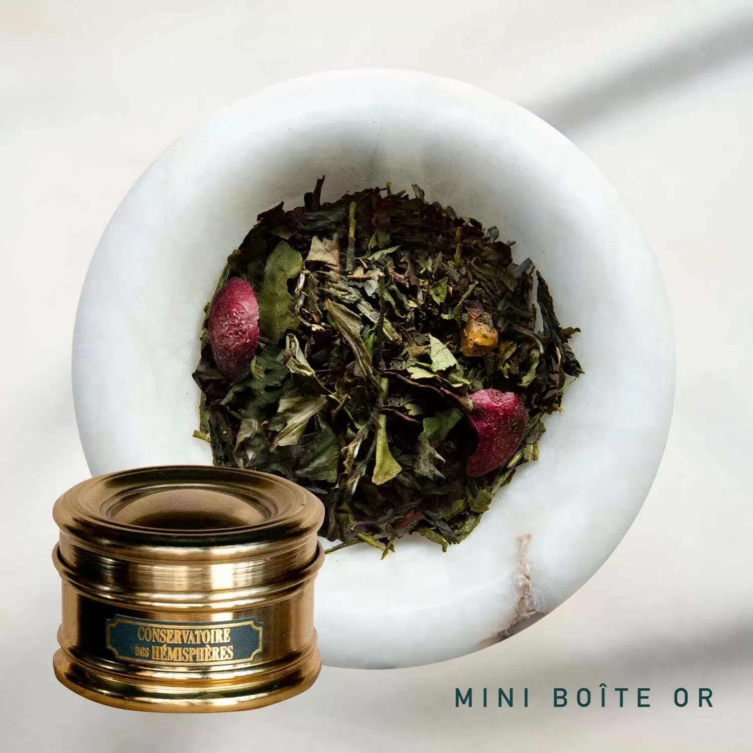 Au coeur de la cité ottomane, entre deux rives continentales, une saveur finement épicée fait de ce thé blanc – pigmenté de thé vert –, l’amusement des papilles. S’invitent au bain, toutes les dames que composent le sérail : grenade, ananas, papaye, dont la favorite reste la figue de Barbarie. Son habit gustatif, drapé des parfums caractéristiques de melons et pastèques, s’unit à l’essence acidulée dont se pare le kiwi. Telles les eaux du Bosphore qui convergent au détroit, la composition à la douceur sucrée conflue jusqu’aux vertus de la canneberge et des baies de goji.