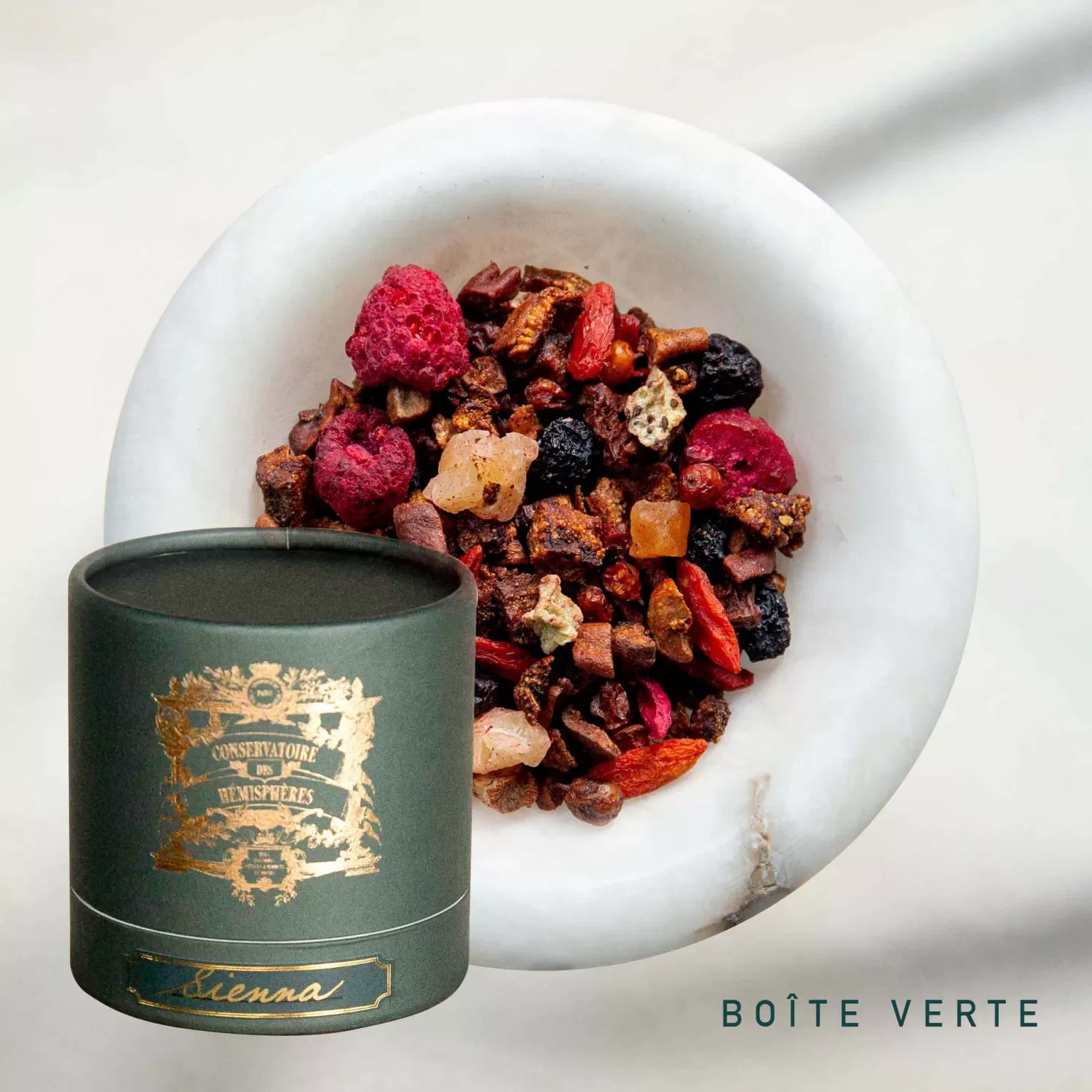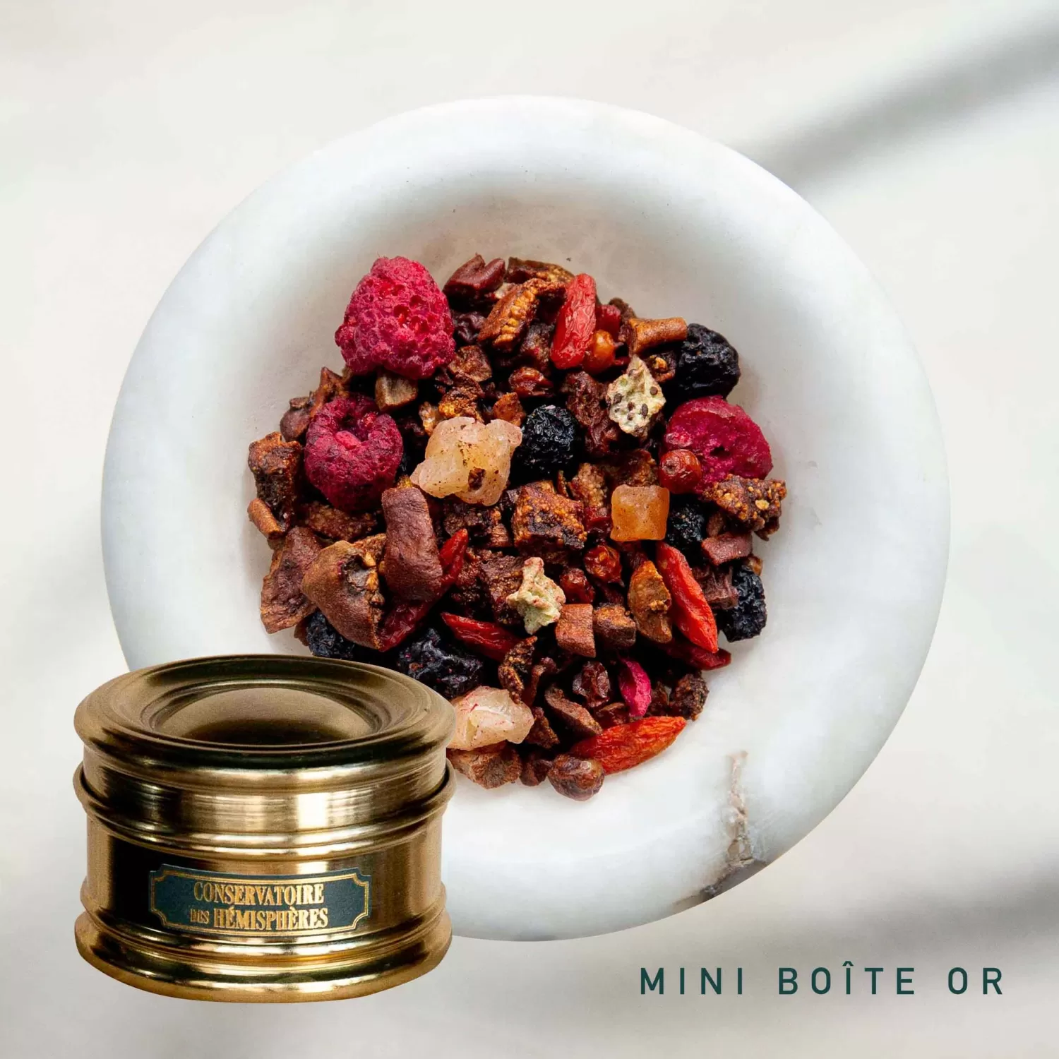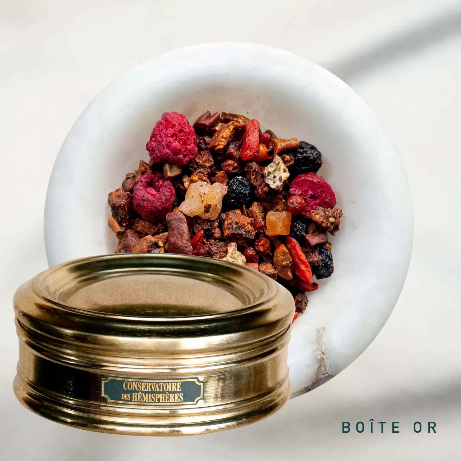 De cette fraternité naît le panache des bois et des vergers : l’alliance intuitive d’une framboise à la malice pure et d’une poire à la prestance sûre. L’infusion prend source en un renfort fruité à la tendre familiarité. Tandis que la baie d’argousier et celle de goji se muent à tour de rôle, entre dans la ronde une ascendance de douceurs : kiwi à l’allure acidulée et papaye d’onctuosité. Bagage fraternel vers les terres ensoleillées, l’ananas confère sa douceur inégalée à l’atmosphère de parfaite entente. Tous célèbrent leur indivisible affection, que viennent subtilement lier de sa teinte noire bleutée, dame myrtille.