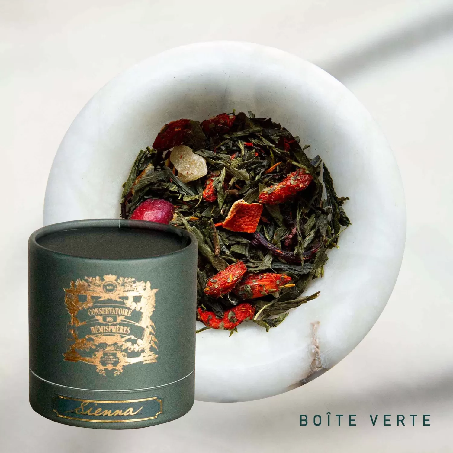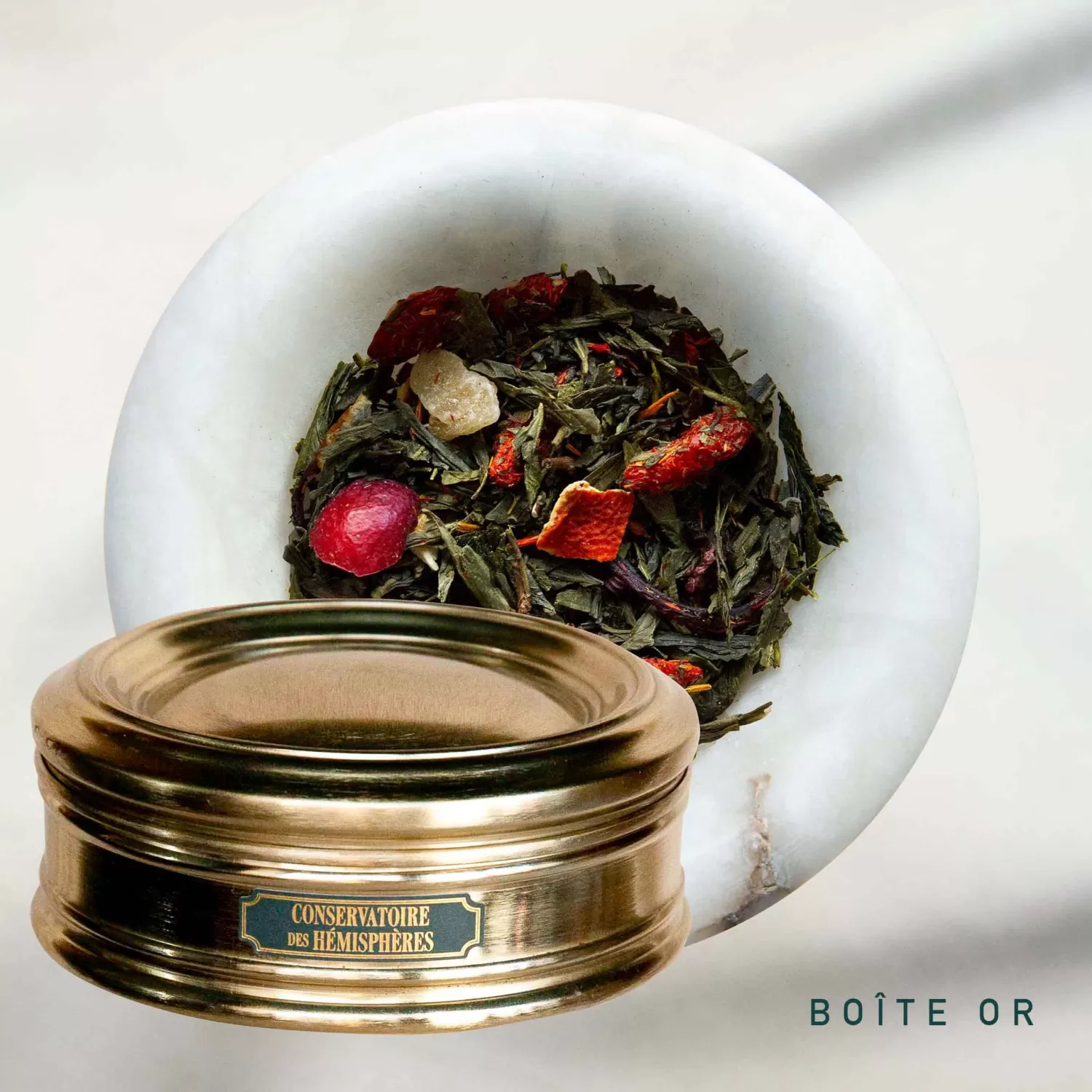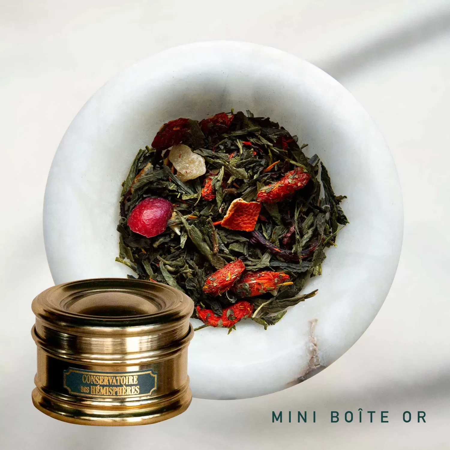L’ensemble du verger ne fleurit qu’à sa vue, l’astre diurne bénit ce thé jaune de ses vertus exotiques. Bouquet aux teintes panachées – la chaleur vive d’une figue de Barbarie, le teint vermillon d’une grenade, les tanins acidulés de canneberges -, côtoie les fruits sauvages et lumineux, la mangue et l’ananas. Écorces d’orange se gorgent d’une fleur d’hibiscus à la note fruitée et carrellent jusqu’au terme le cheminement solaire de cette composition, tandis qu’une pointe de carthame donne de la rondeur à l’ouvrage.
