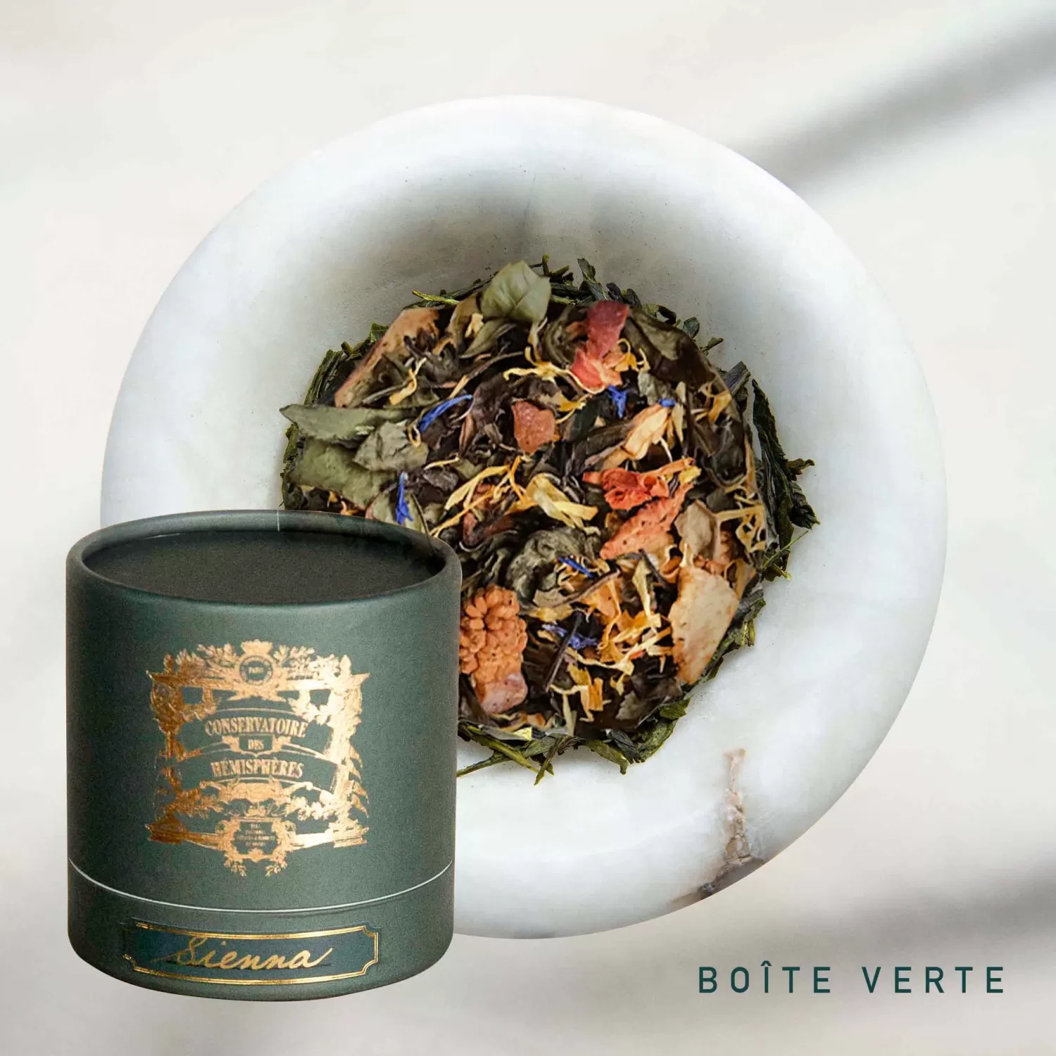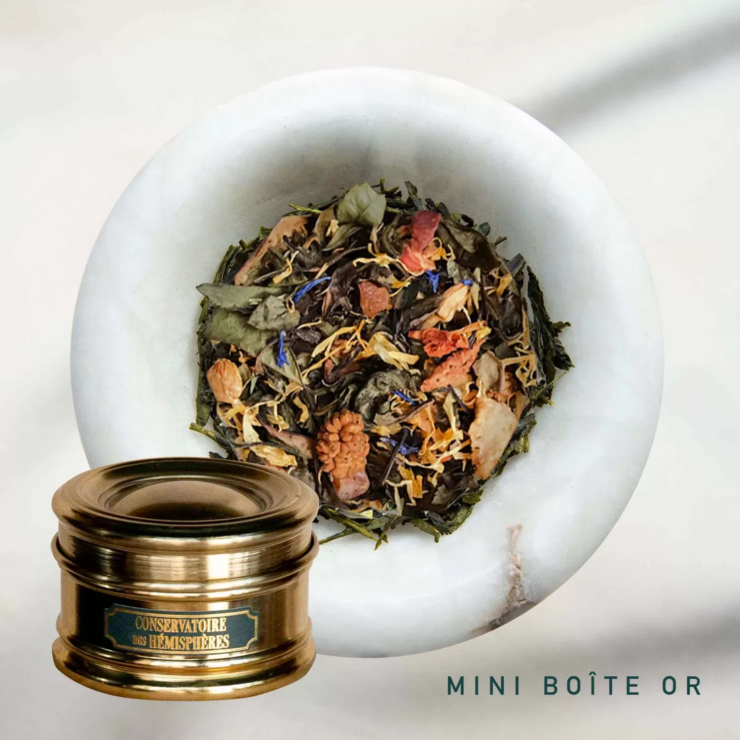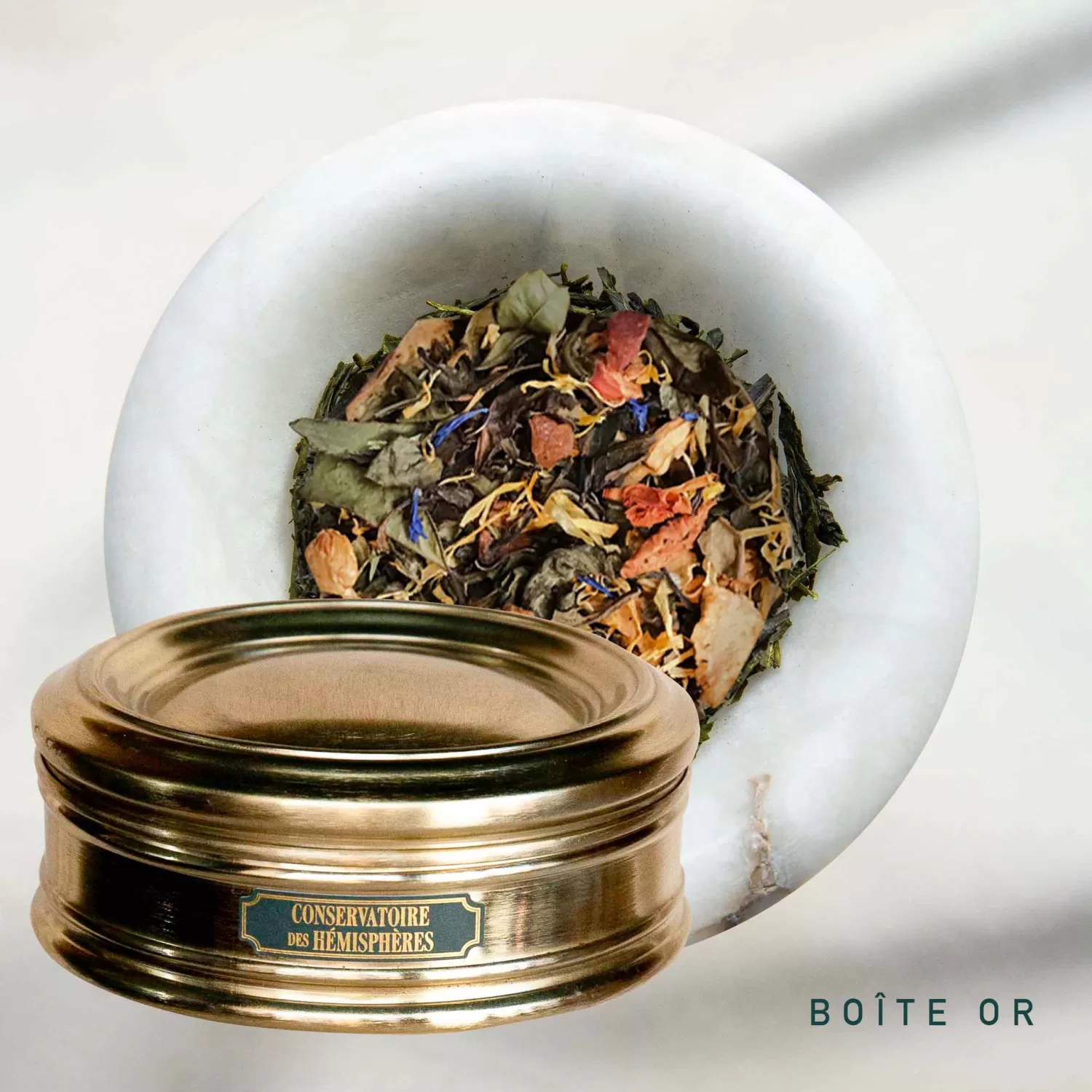 L’alliance exceptionnelle des thés blancs et verts. Le liage se voit magnifié par le fruit : mûres sauvages, côtoient les cimes douces d’une papaye vivifiante quand, en entremise, les quartiers de pommes arrondissent la saveur en de malicieuses notes de miel.