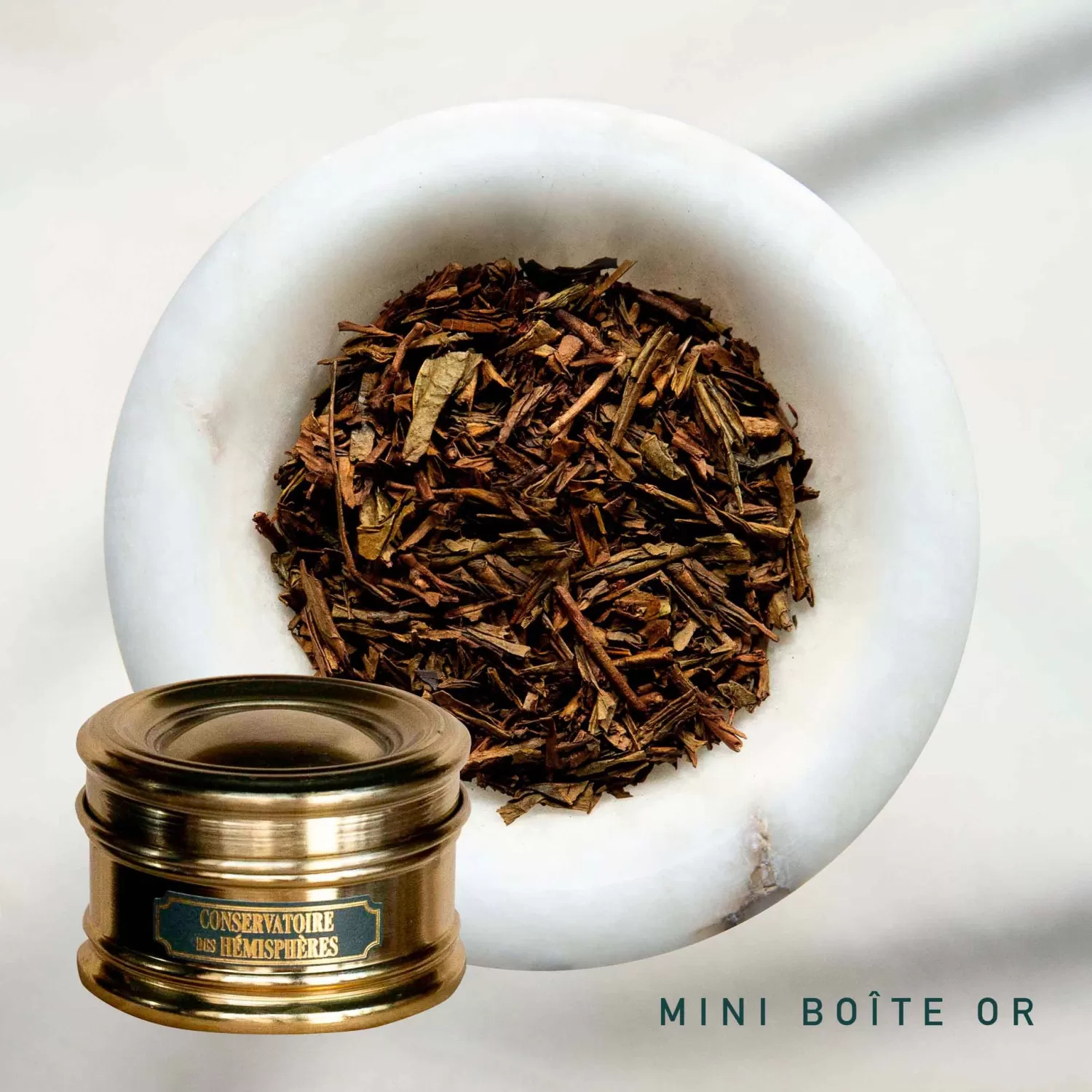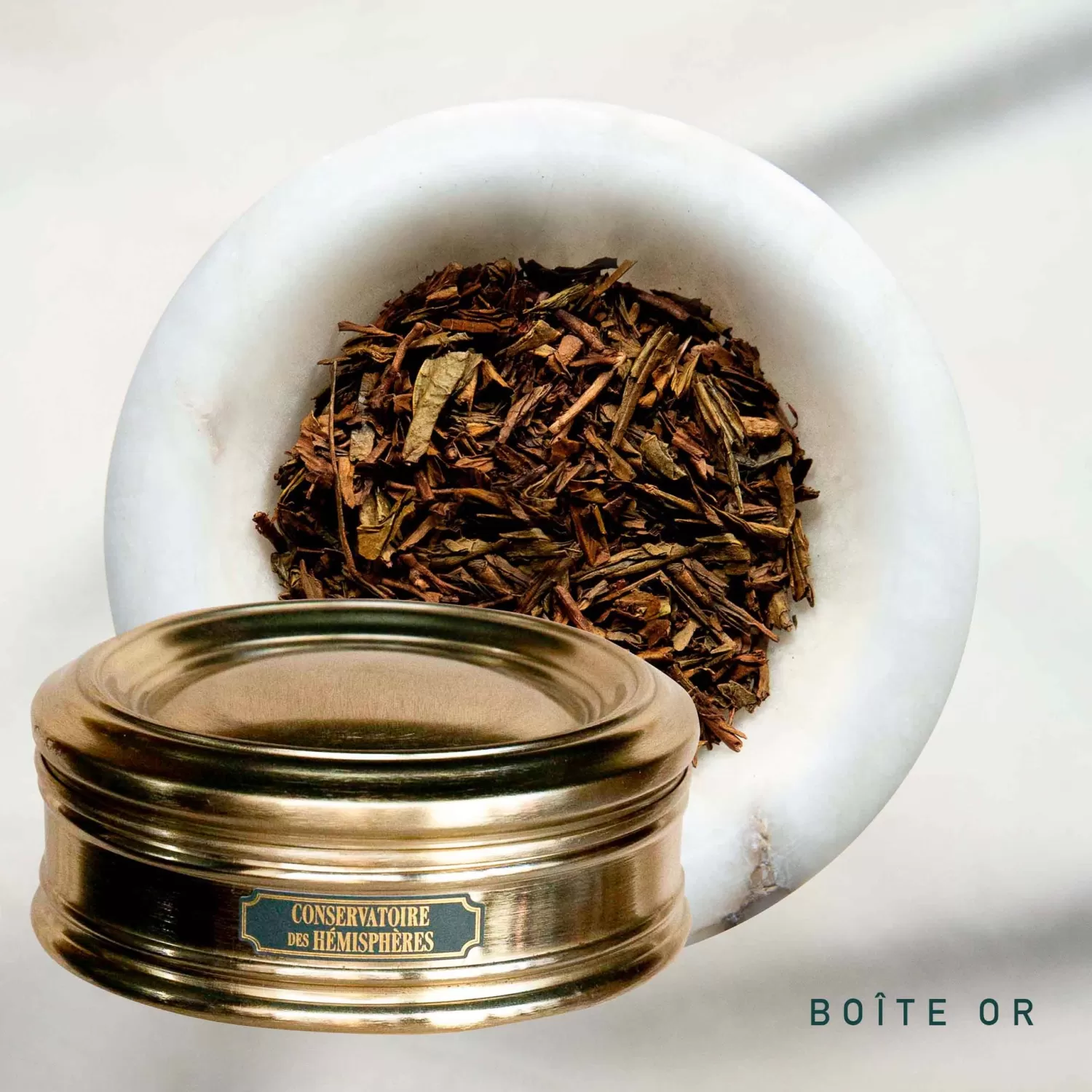Bien que sa robe ne revête pas les chromatiques habituelles du thé vert, le Hojicha – littéralement “torréfié” – s’accommode de la couleur airain ou ébène. La calcination à feu nu de ses feuilles induit un envol aromatique de l’infusion, aux arômes pyrogénés et aux pourtours sèchement boisés. L’attaque marine, propre aux thés japonais, se dote d’allants fruités dans le sillage d’une liqueur à la couleur ambrée. Il est un thé désaltérant et faiblement théiné : sa dégustation est congruente à tout moment de la journée.