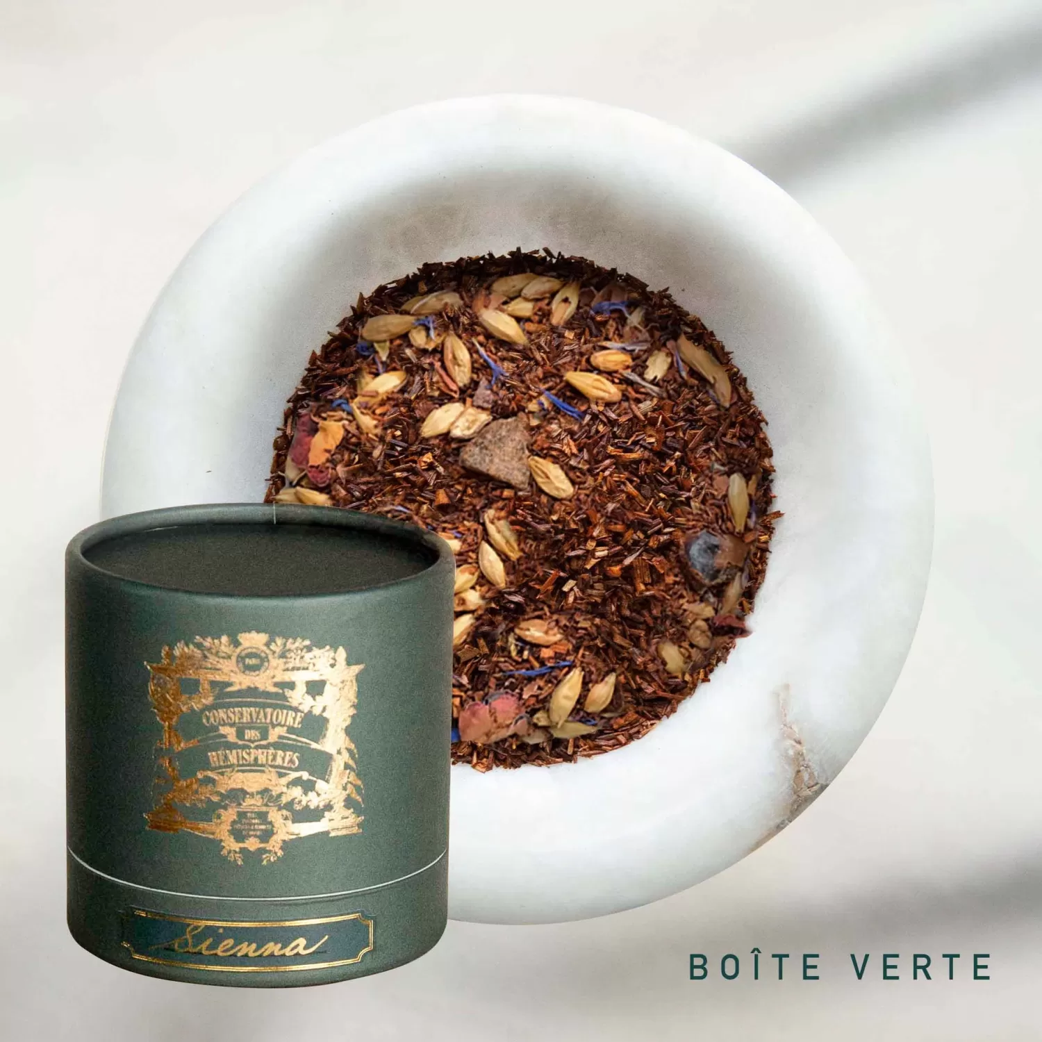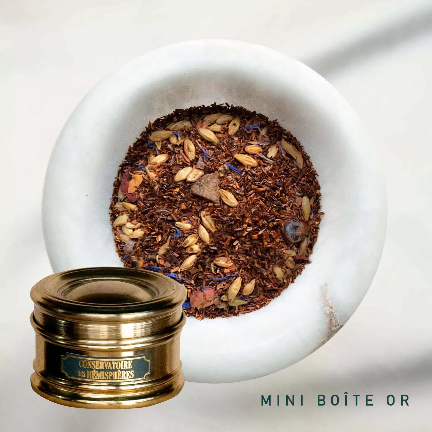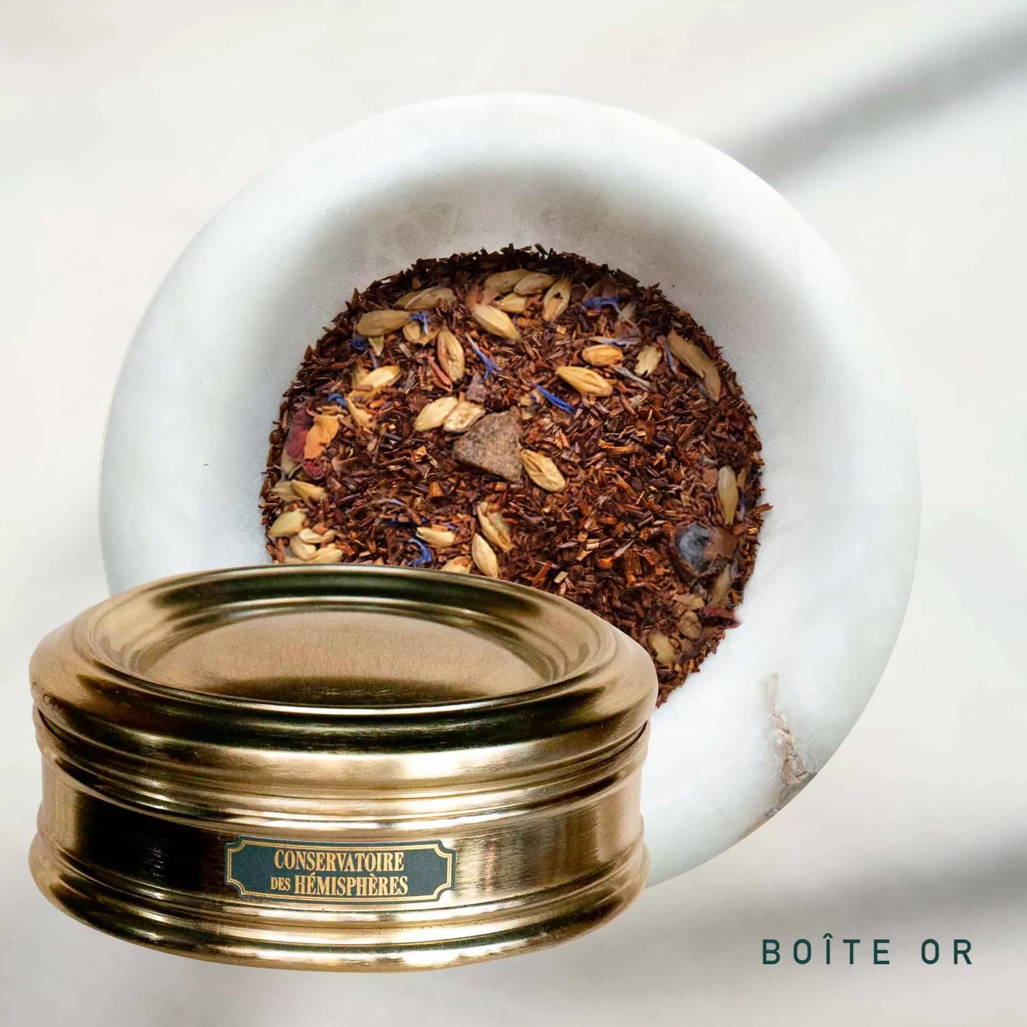 En véritable joyau, ce rooibos se tresse à la bananeraie telle une liane de flaveur. En filiation, les pétales de roses introduisent leurs émanations délicates et acidulées. Voici que l’apparition fruitée de la datte ne manque pas à séduire les goûts les plus nobiliaires, lorsqu’un cortège de cosses de cacao accompagne avec malice le parfum des grains d’orges. De leurs plus beaux apparats, les pétales de bleuets à la couleur pleine de magnificence – embellissent de teintes lazuli cette infusion des après-midi. Le petit trianon ou l’humeur souveraine des causeries, et tables enchanteresques.