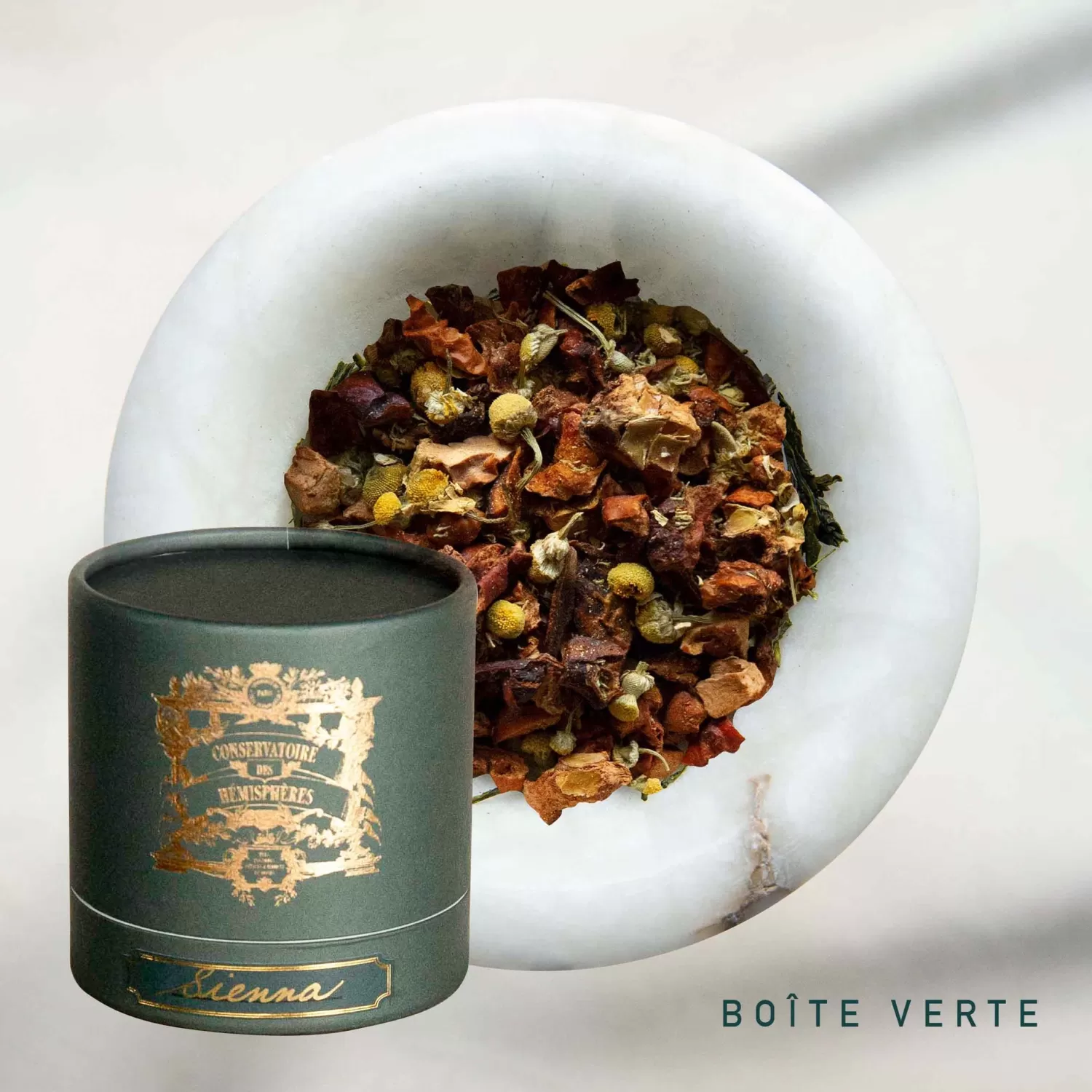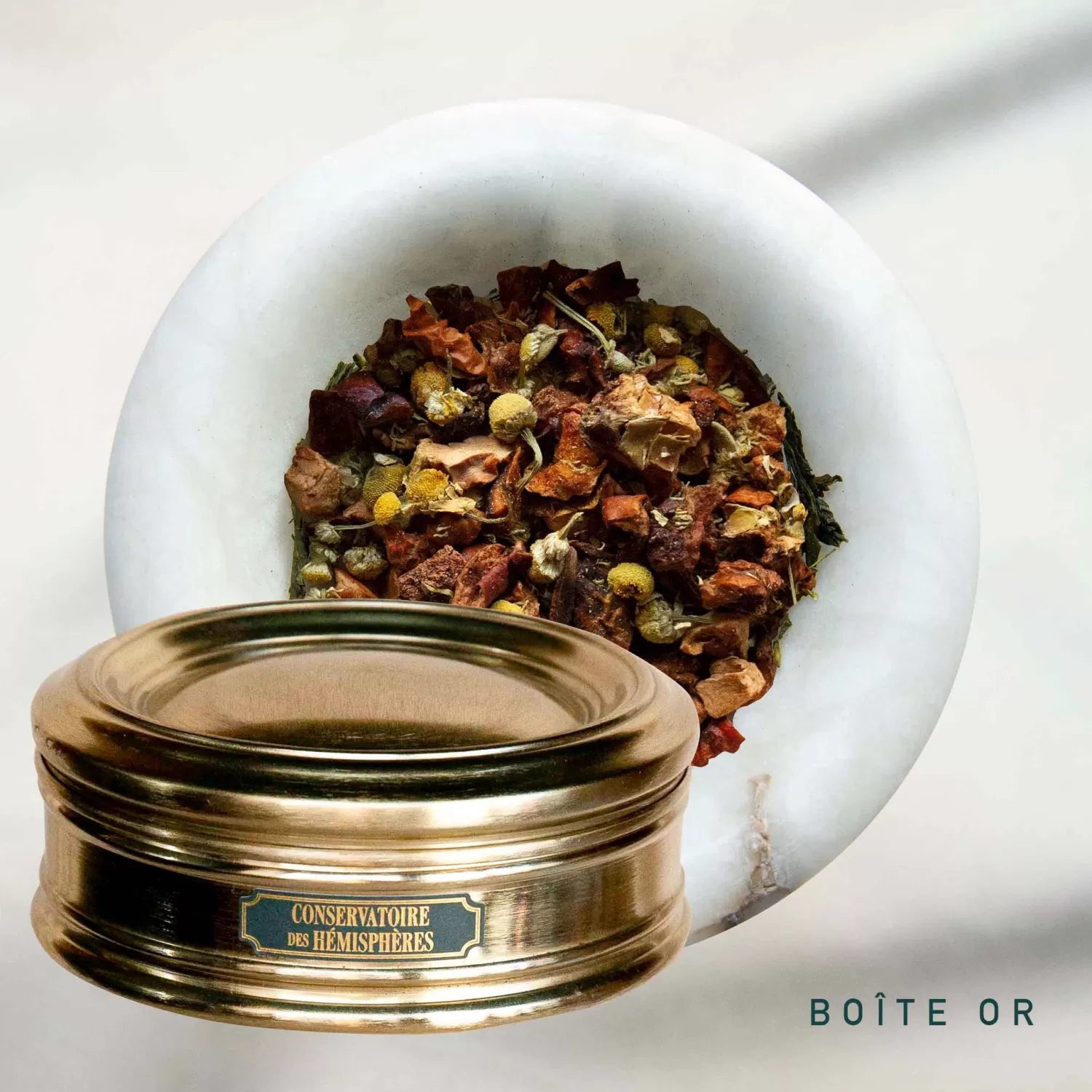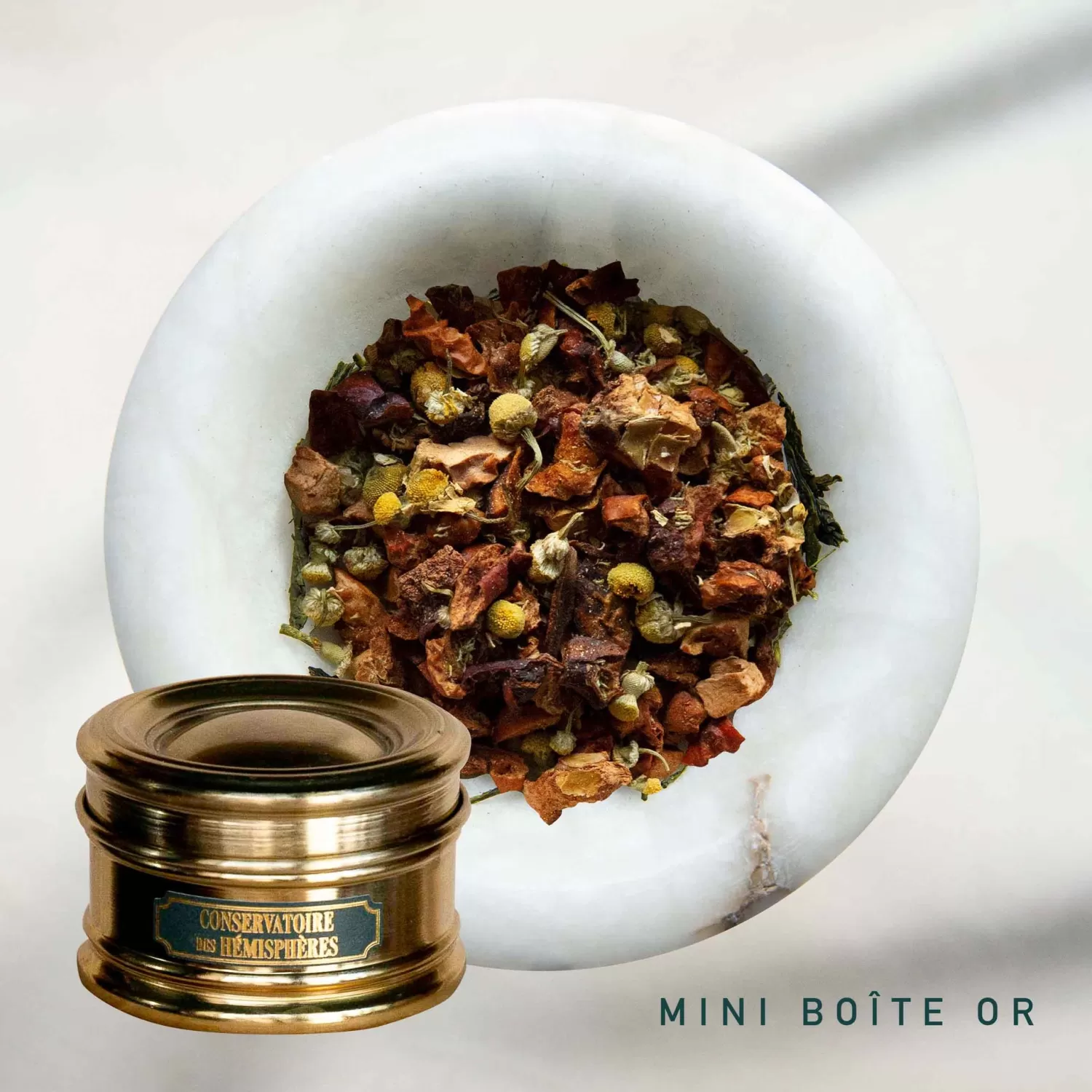 En un verger chatoyant – à l’ombre des arbres en fleurs –, l’écorce du cannelier entretient une douce relation avec sa favorite, la pomme. La compagnie d’une camomille conciliante apparaît comme un gain certain. Délassement des esprits, apaisement des corps sont escomptés en cette infusion du soir.