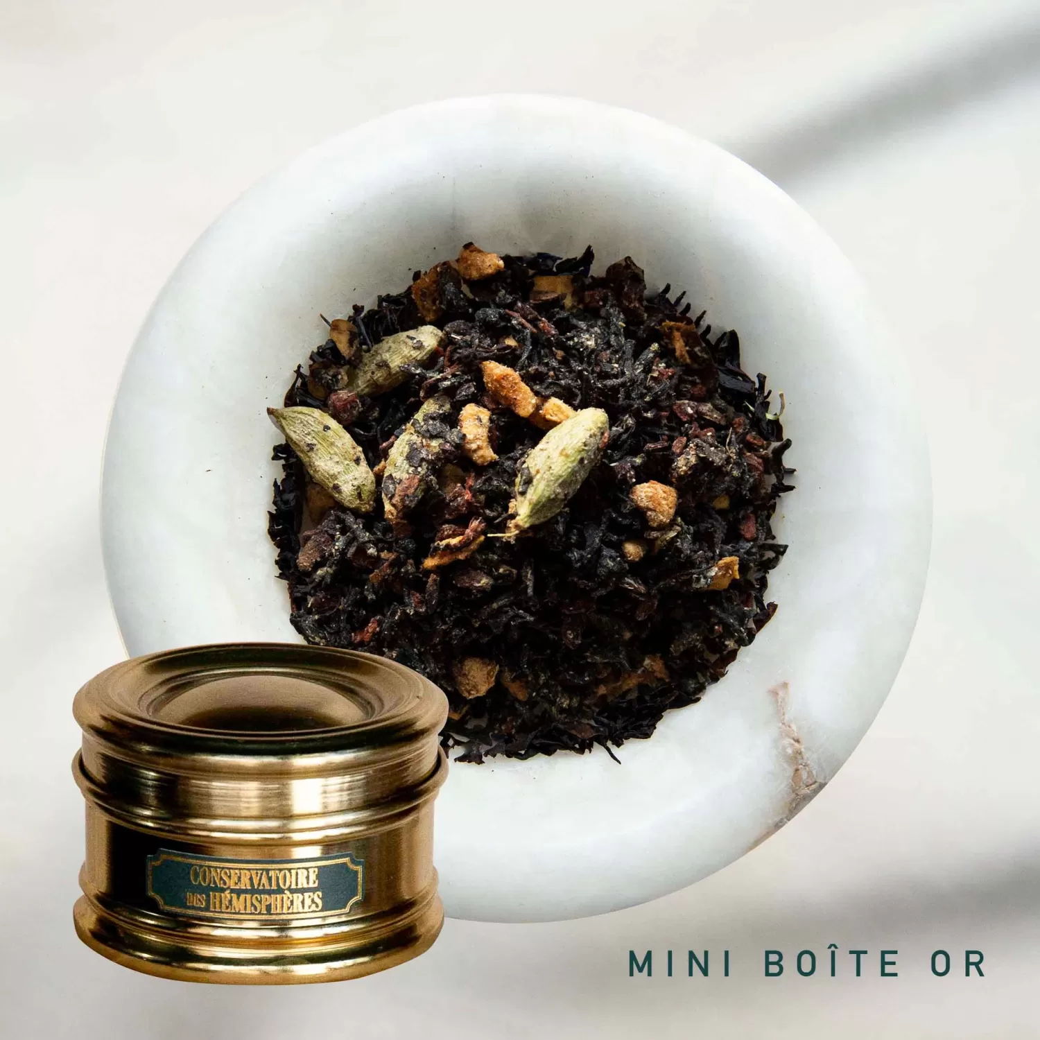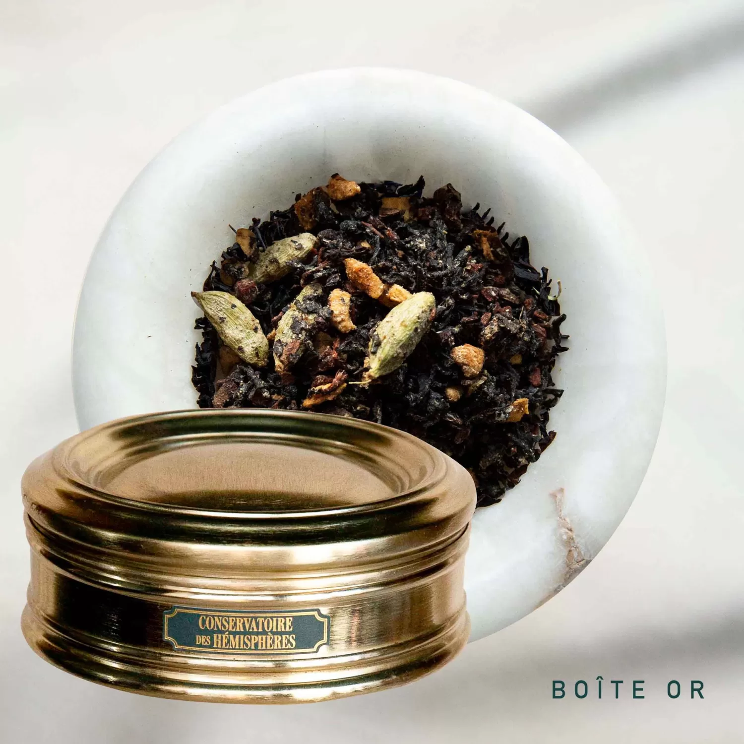 Le véritable masala chai règne en maître sur le territoire indien et s’invite traditionnellement à l’heure du déjeuner, qu’il soit petit ou grand. De son existence épicée — gingembre, cannelle et cardamome —, naît une essence de miel, source d’une douceur réconfortante. Un thé noir singulier, puisqu’il s’infuse dans la volupté du lait et non dans l’eau coutumière.
