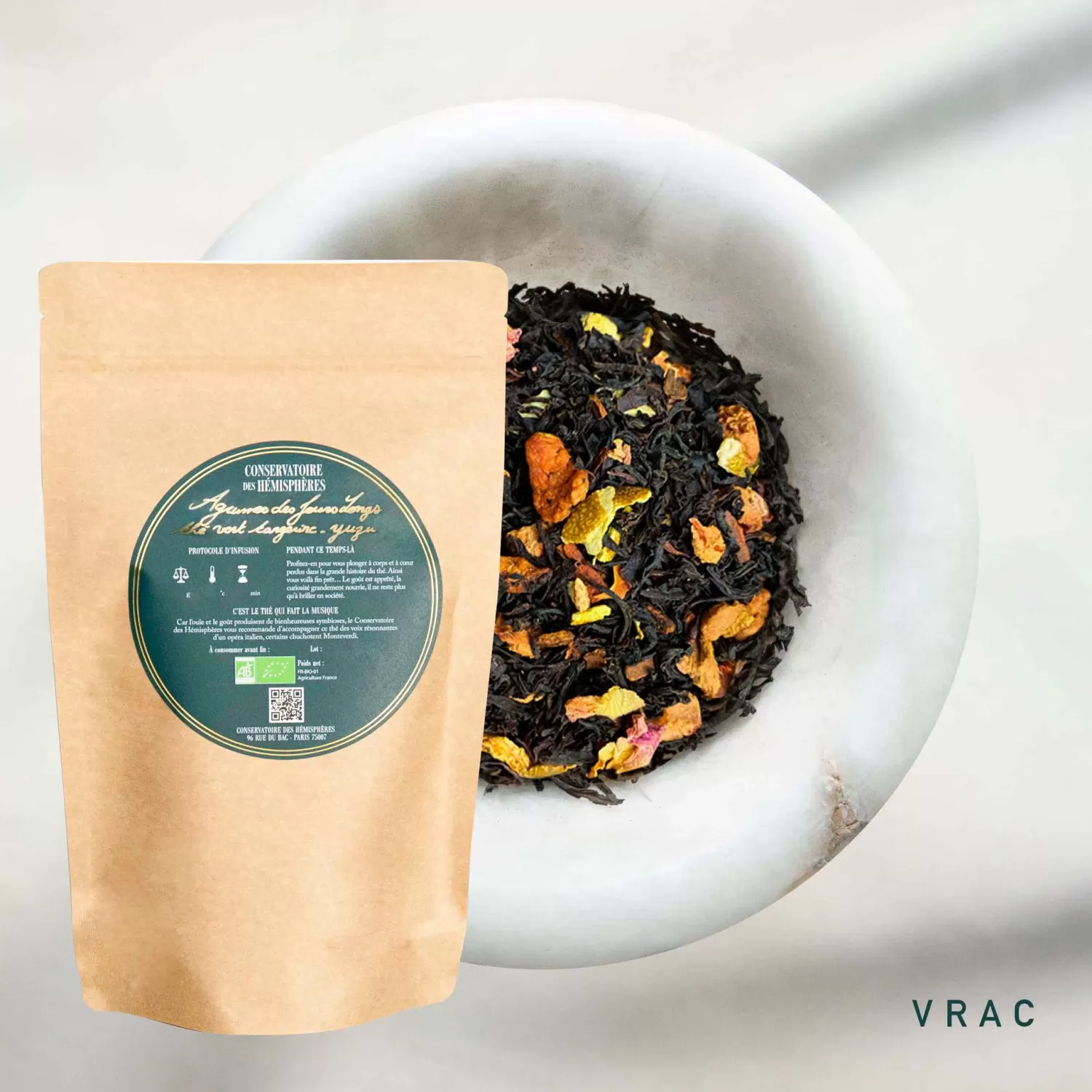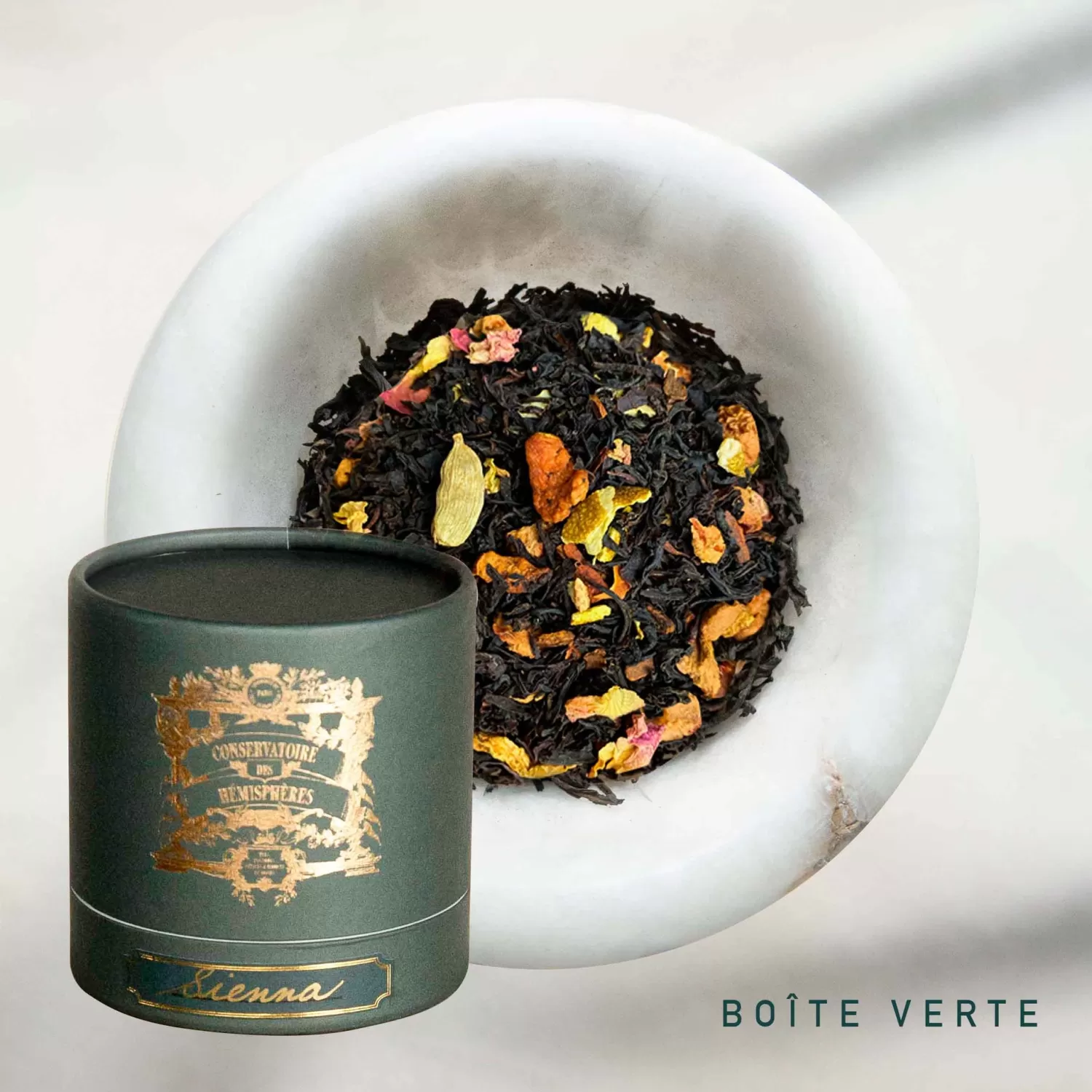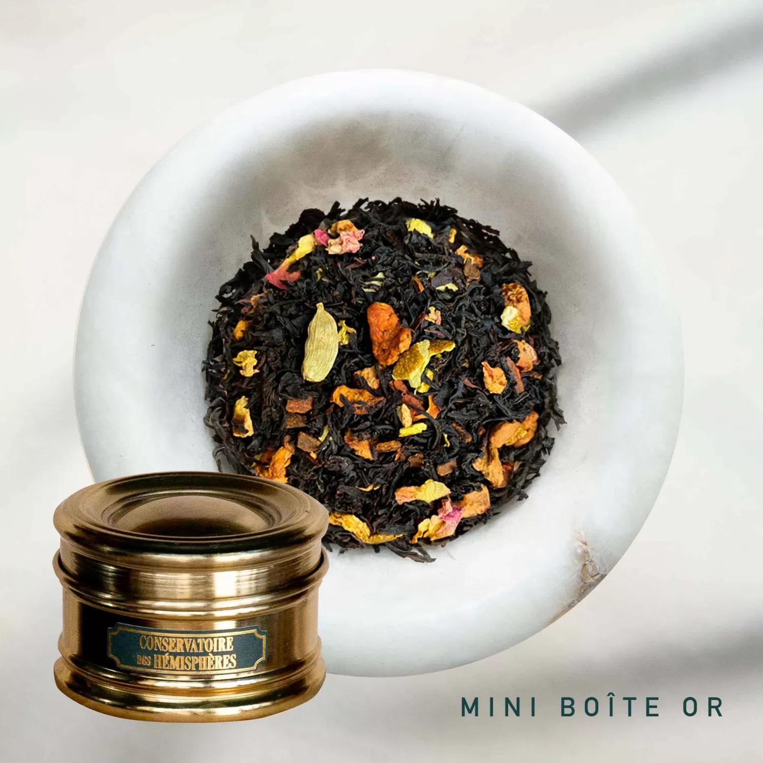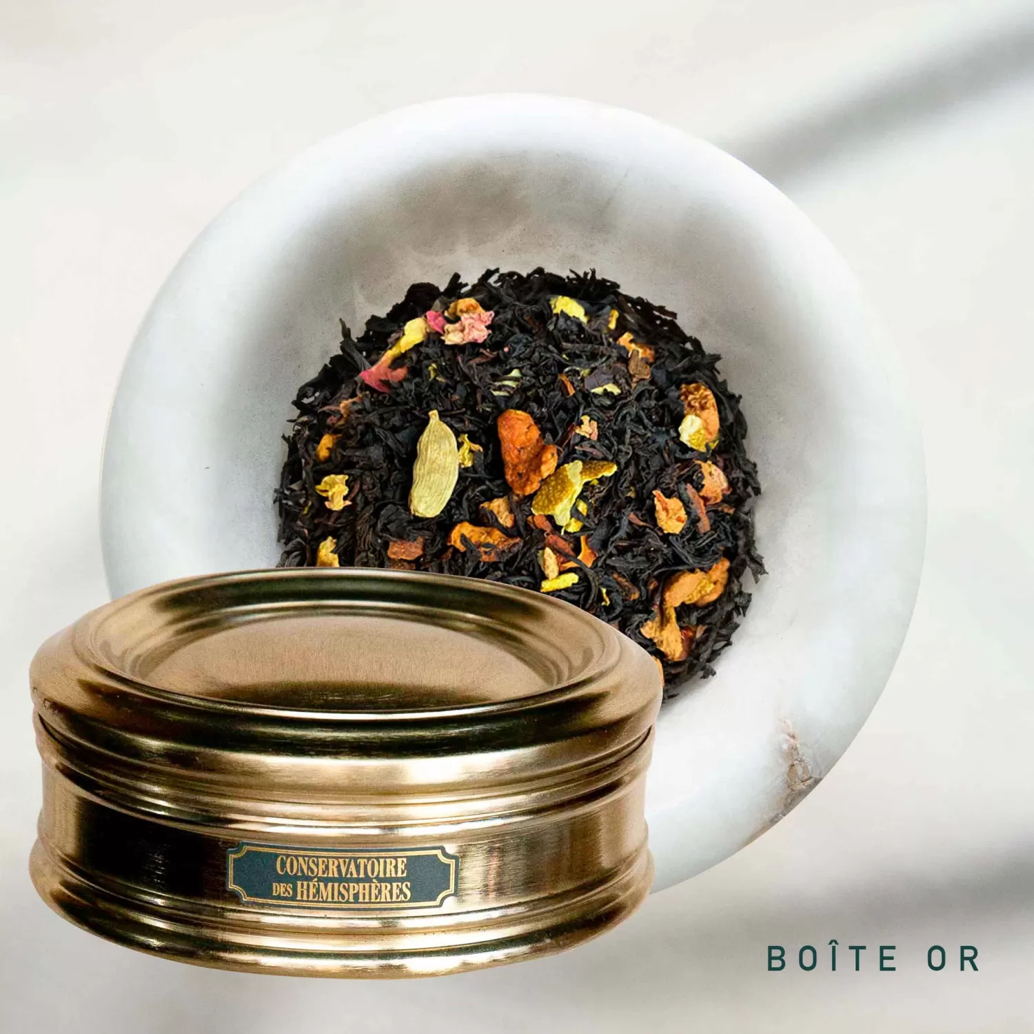 Ce thé noir d’Assam en provenance d’Inde du Sud côtoie quartiers de pommes, écorces d’orange et bâtons de cannelle. Sous la félicité de la cardamome et des pétales de rose.