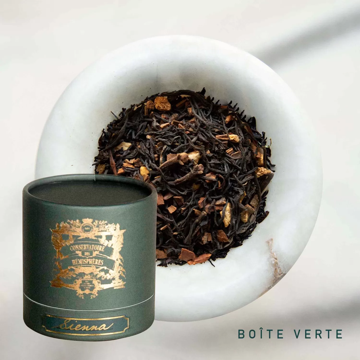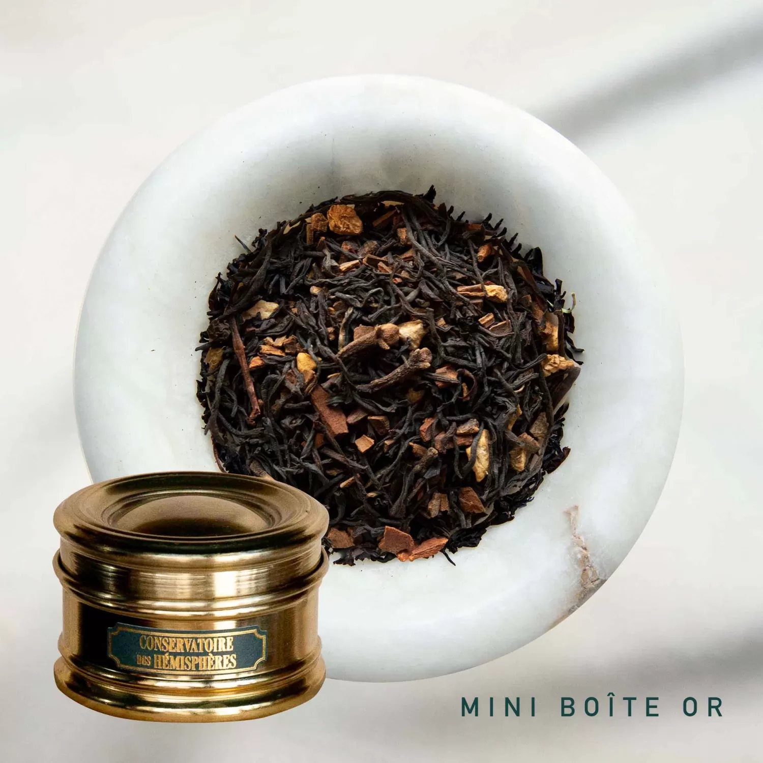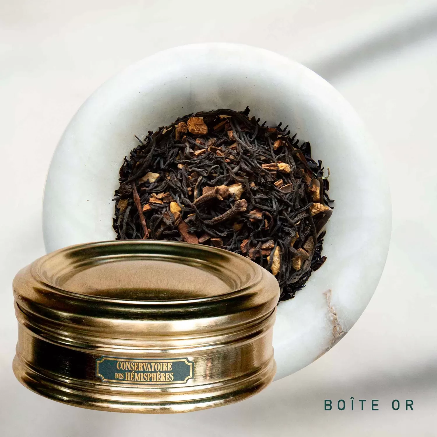 À l’ombre d’un palais, où les teintes de grès se muent selon la cadence du soleil, viennent s’attrouper les premiers ingrédients dont le Chai ne saurait manquer. Le gingembre citronné, fleuron des terres hindoues empreinte la coursive qui le mènera en des espaces épicés : cannelle aromatique, girofle amer et cardamome anisée. Sur cette façade aux mille oriels, le poivre épand son caractère piquant et scelle la révélation. Un thé noir naturellement épicé dont on ne présente plus la singularité.