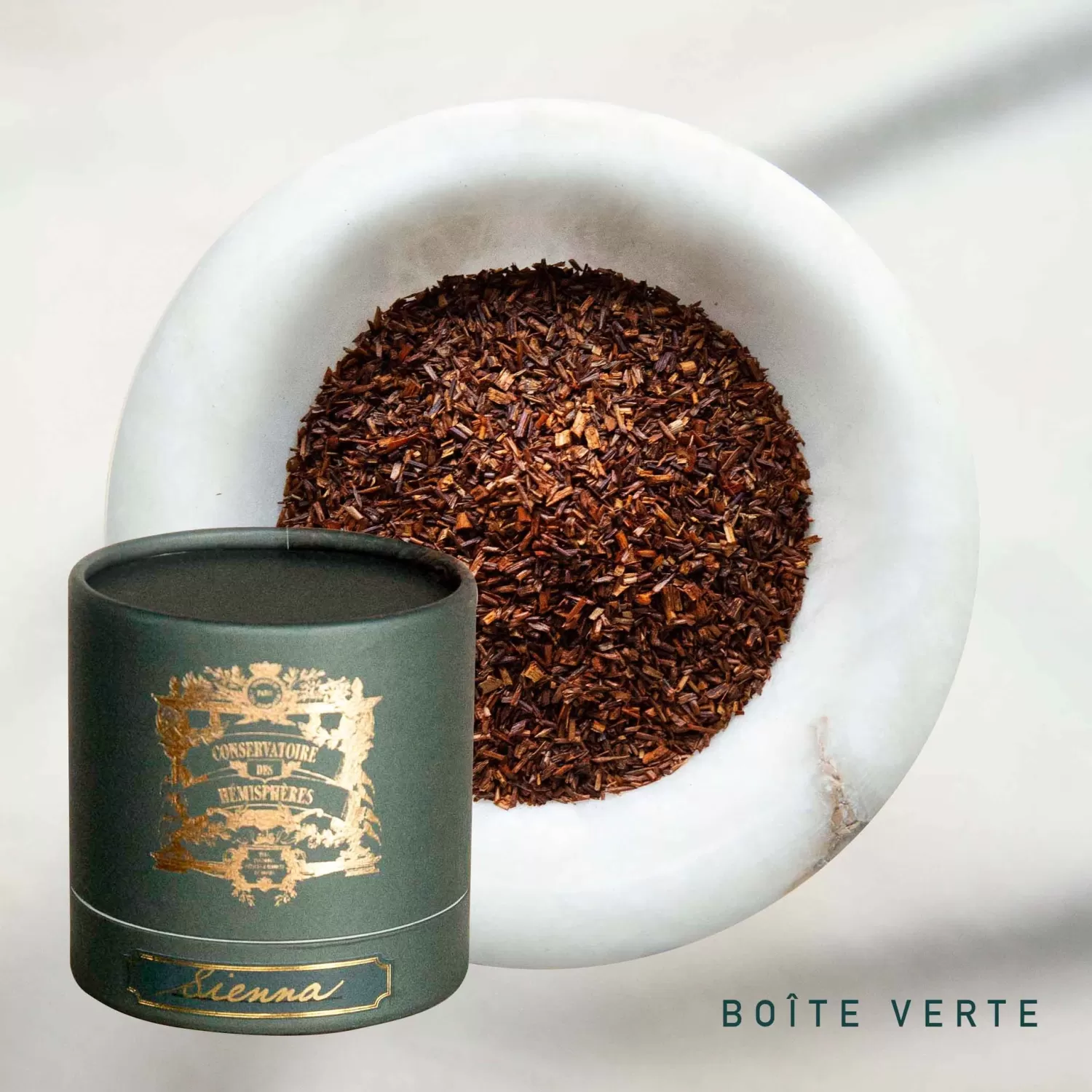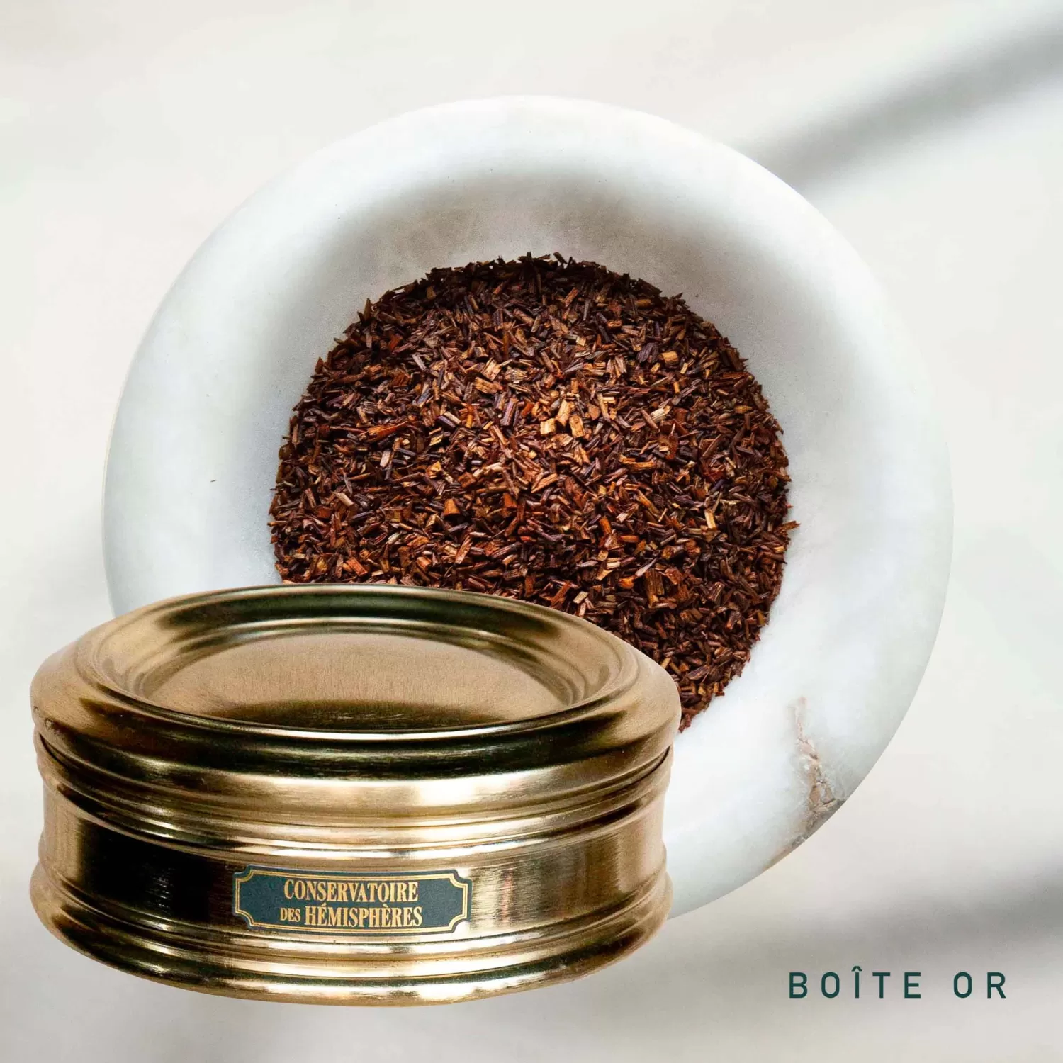 Le rooibos puise en ses origines afrikaans et ses racines désertiques des notes incomparables oscillant entre le bois et la vanille. L’acacia pour ascendance, cette plante endémique — aspalathus linearis — se charge en antioxydants, stimule le métabolisme et procure une énergie naturelle certaine. La légende ne dit point si la vigueur transmise est corrélée à la capacité remarquable de ce petit ”buisson rouge” à renaître tel un phénix de ses cendres, après la survenue d’incendies australs. En infusion, elle révèle au regard une parure de cuivre au rouge profond, lorsque son onctuosité adhère au palais et épand une délicate saveur sucrée en bouche. D’une qualité première, le rooibos supergrade doit sa richesse et sa palette aromatique complexe à l’ample broyage de ses feuilles où s’éveille subtilité et incomparable finesse.