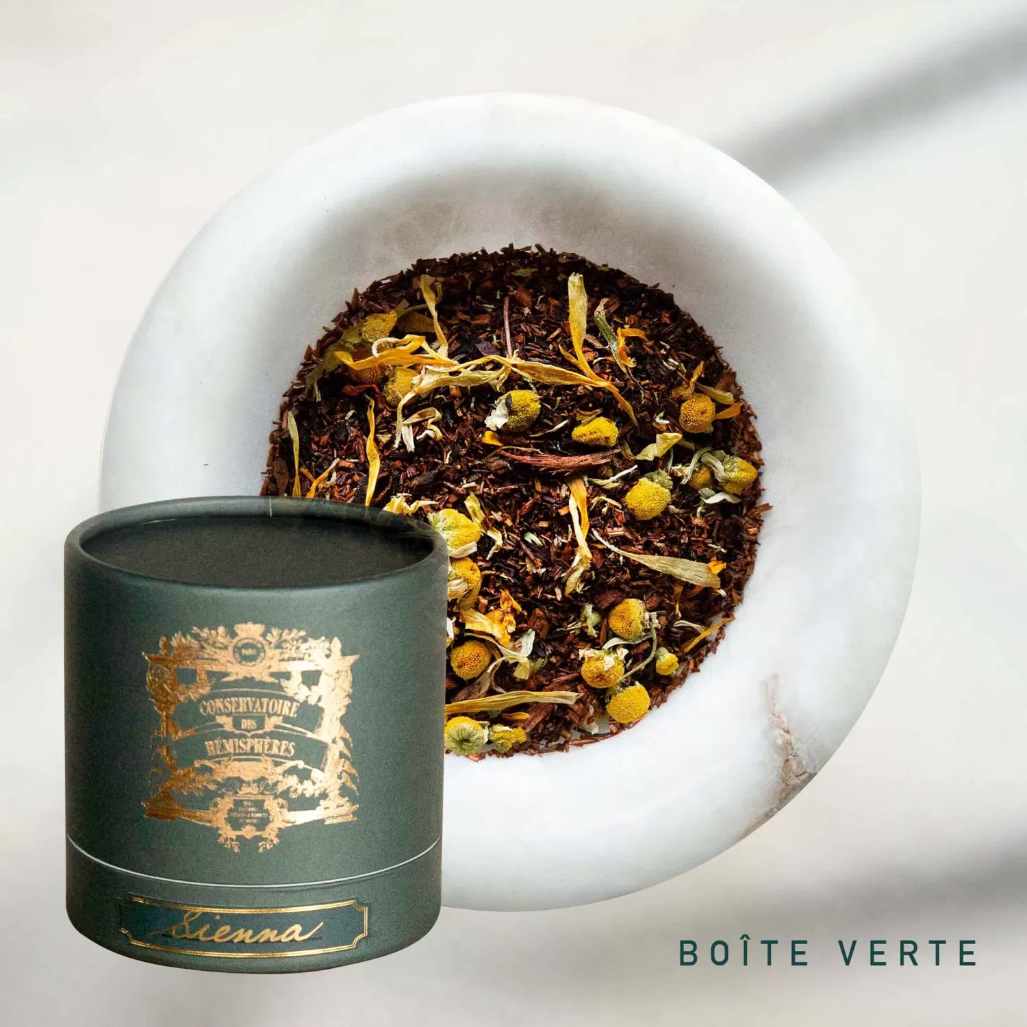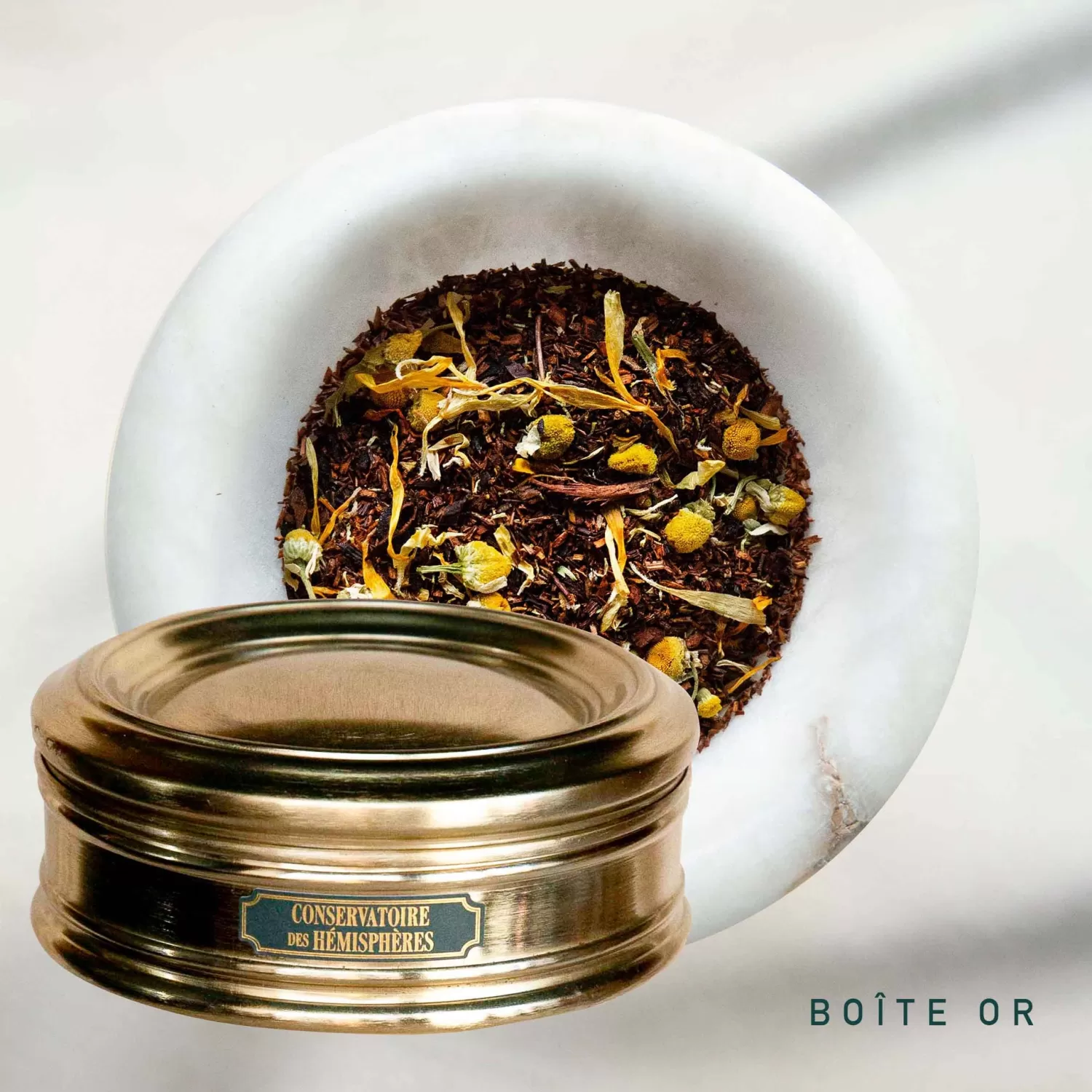L’enfance mérite son pesant de polissonneries, de légèreté de l’être et de douceur exacerbée. À la candeur du rooibos, viennent s’aventurer l’onctuosité du miel et le réconfort sucré de la datte, ingénieusement agrémentée d’une pointe de vanille Bourbon. Pour rétablir la balance des bêtises gourmandes, un soupçon de camomille. La composition se voit grandie par une once de fleurs de souci. L’après-midi sonne enfin quatre heures, l’infusion est une récompense au parfum consolateur. Ce rooibos des éveils du printemps s’apprécie toujours en heureuse compagnie.