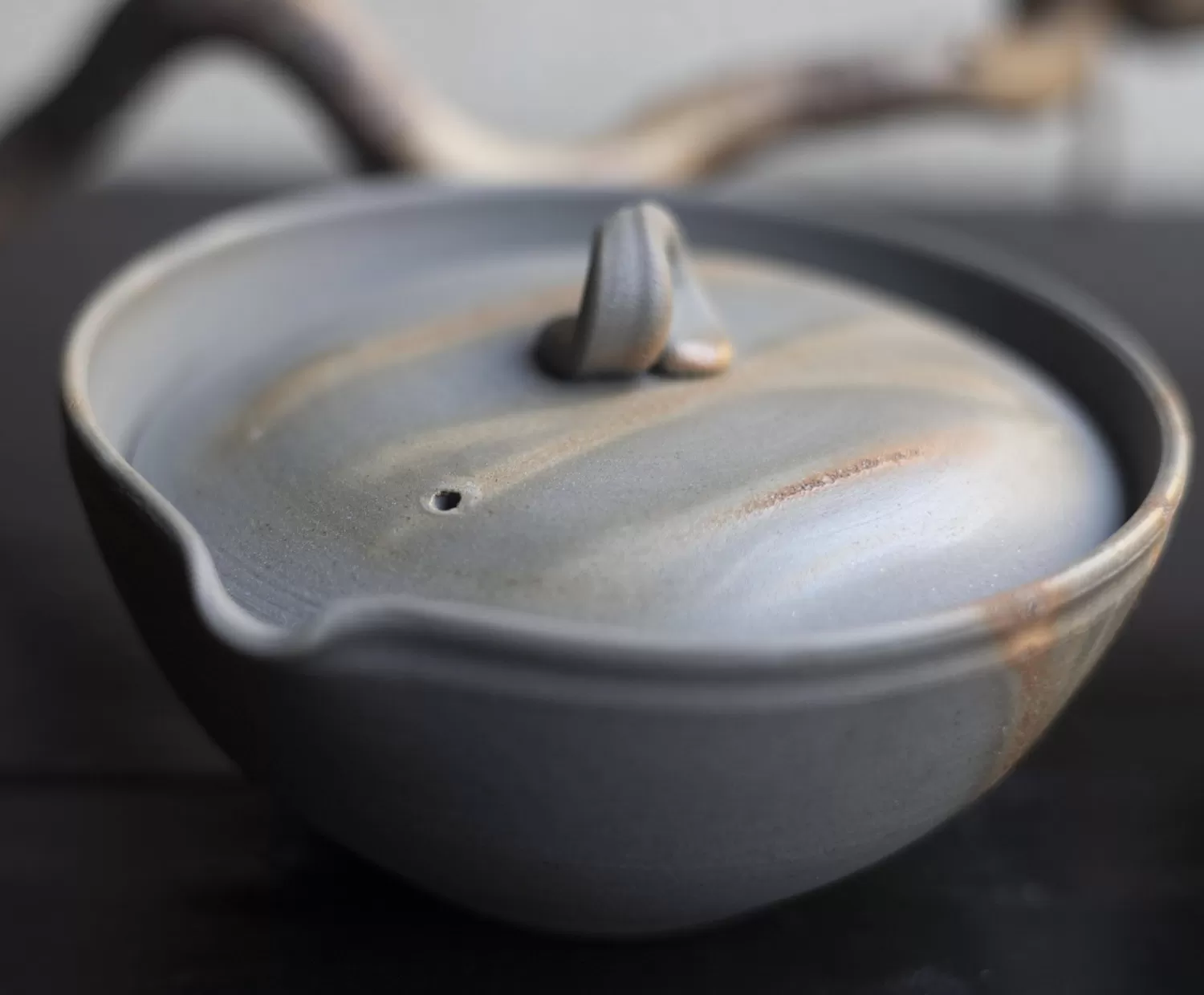 Le Shiboridashi est façonné par la technique typique de Bizen, « hidasuki » qui consiste à enrouler de la paille autour de la pièce avant cuisson. Ici, avec une technique de cuisson en réduction proche du « ao-bizen », la paille laisse une trace rouge sur une terre à la couleur foncée grise-bleue, créant un contraste saisissant.