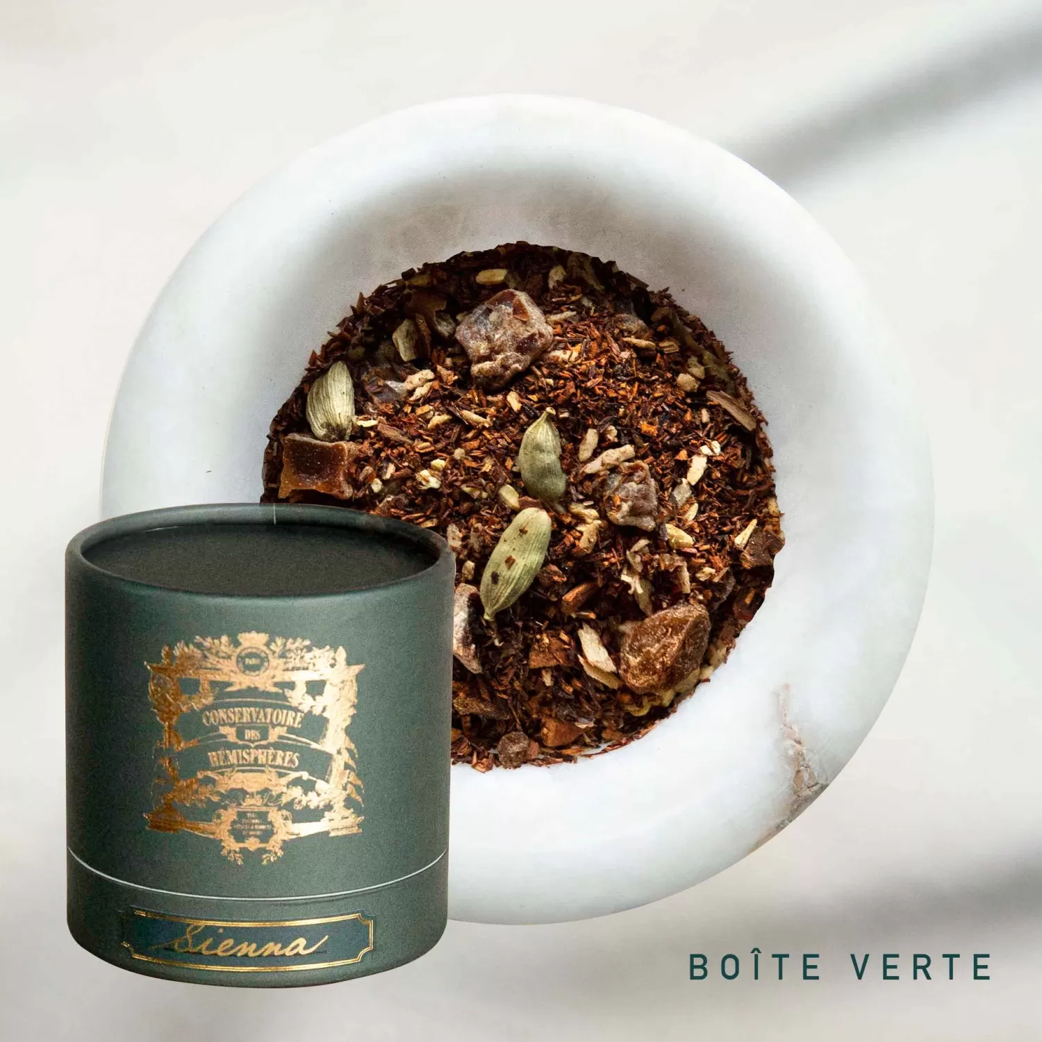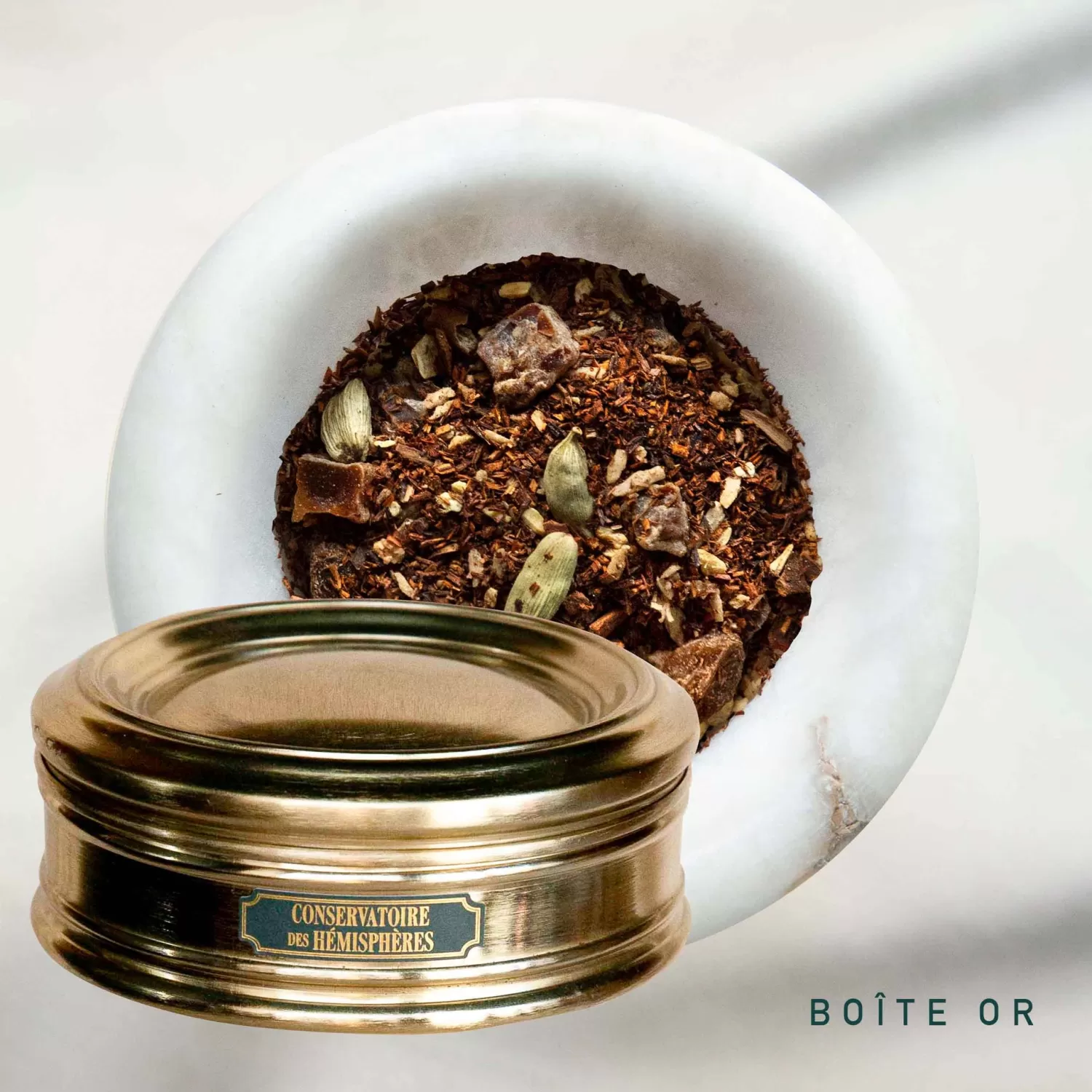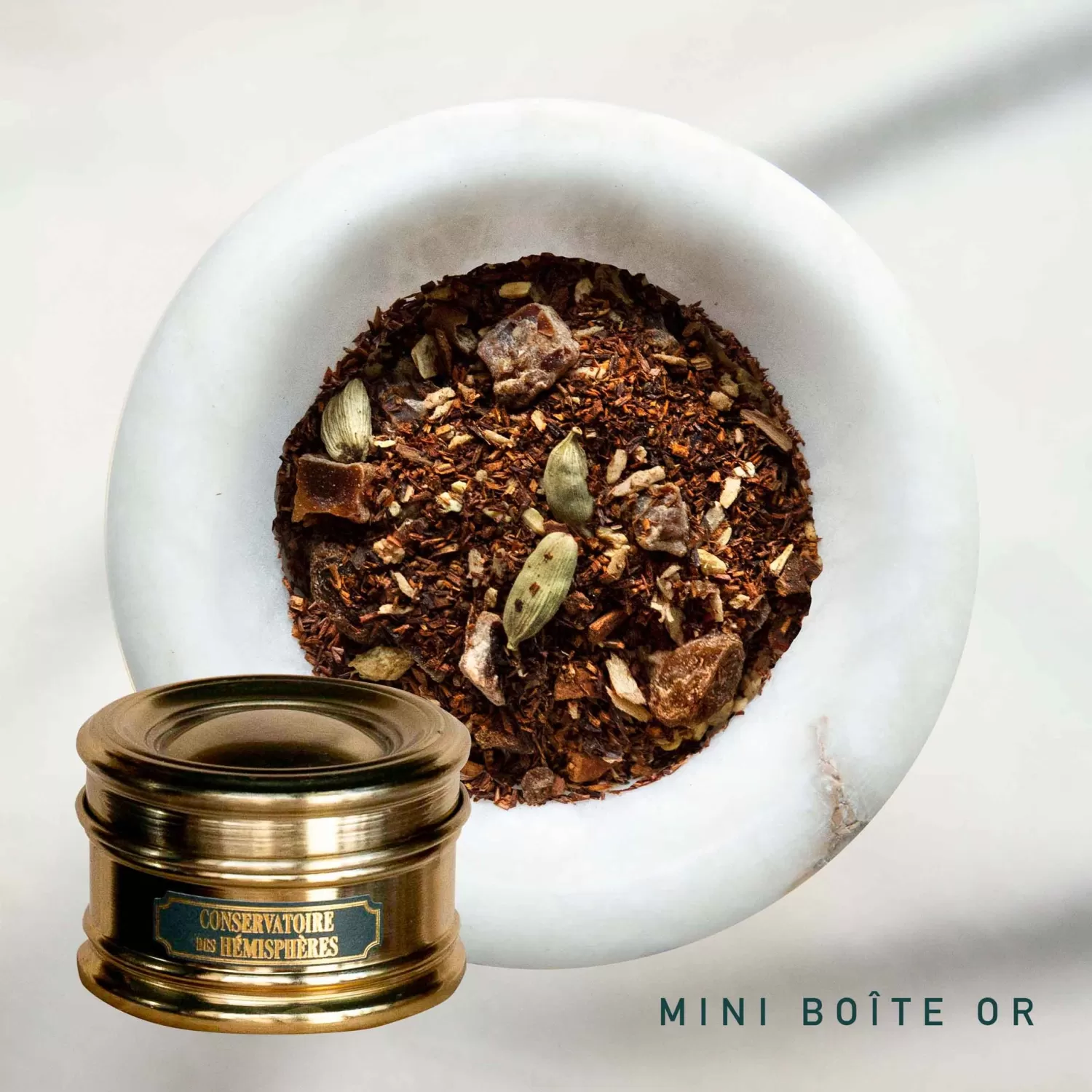 De la mère naît l’enfant, de la terre naît l’arbuste. Le rooibos, à l’ascendance sud-africaine, s’allie au buisson à miel pour offrir à cette infusion la teinte des briques rougies d’une Toscane en fin d’après-midi. Sous le pinceau de Fra Angelico, le bâton de cannelle, la racine de gingembre et la cardamome d’une note citronnée s’unissent en un pas de trois. C’est la gigue des épices, à laquelle ne peut que s’adjoindre la douceur des fruits. Lorsque la datte joue l’aînée, c’est le raisin en cadet qui tend la main à la noix de coco, sa benjamine. D’un amour maternel, la gousse de caroube à la descendance chocolatée, porte en son sein la fierté de l’accomplissement ultime.
