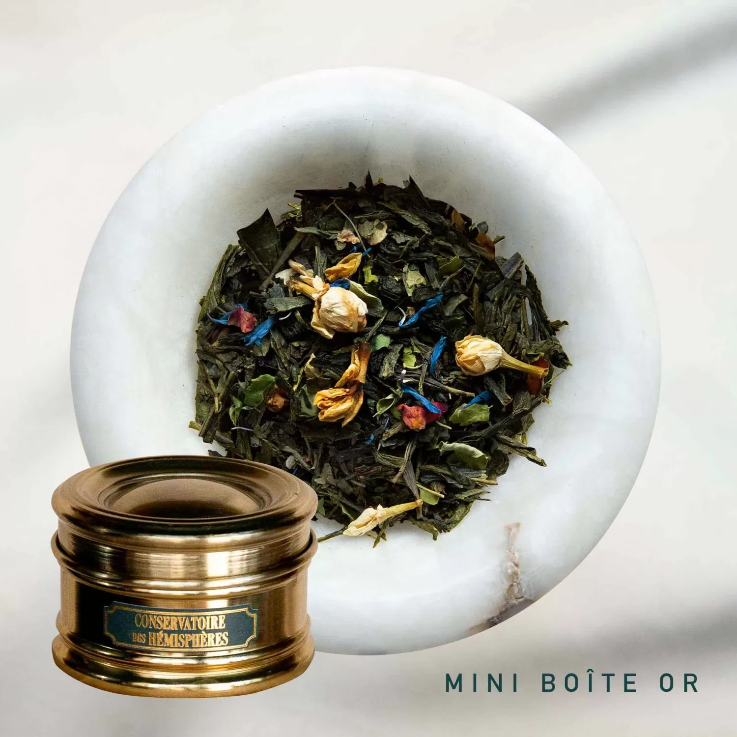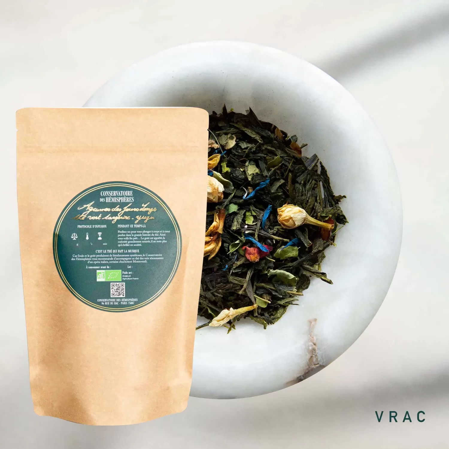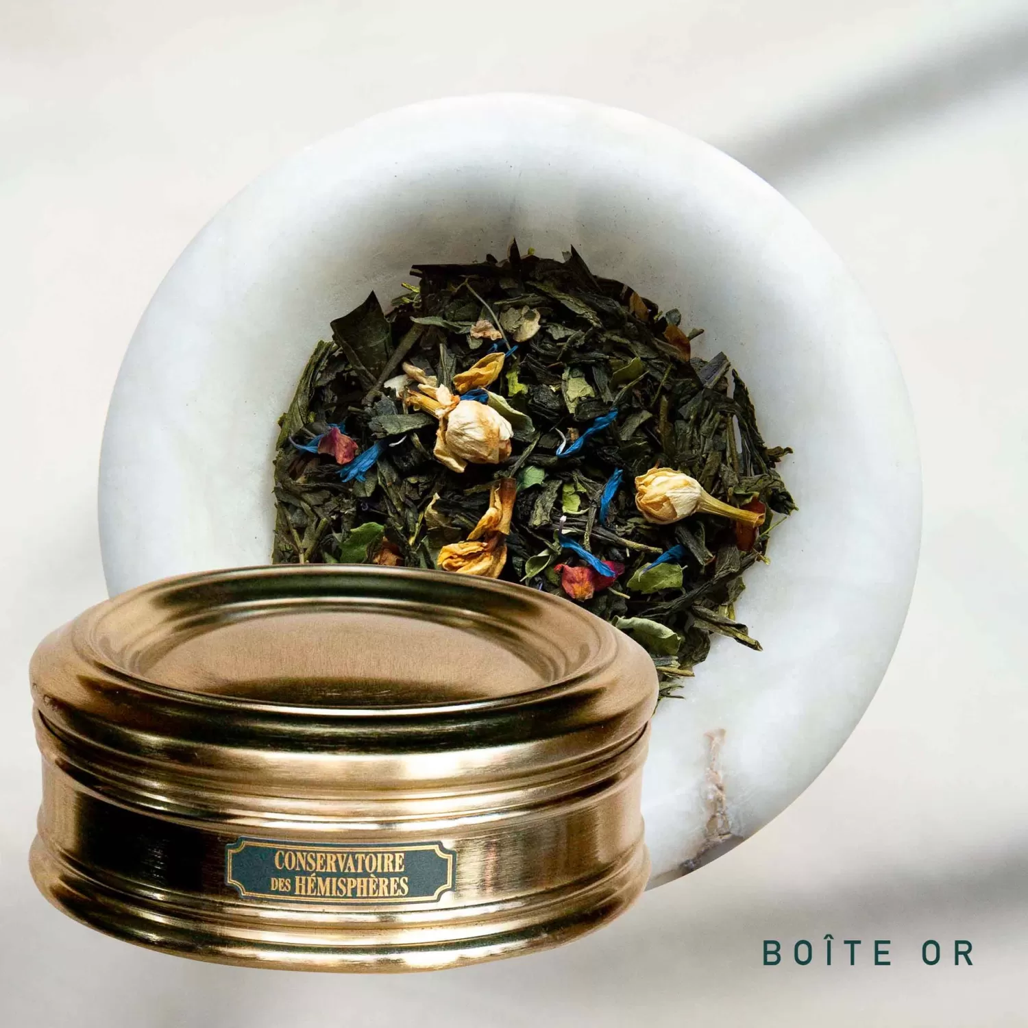 Le thé déploie sa robe impériale de verte brodée. Les brins des bambous, à la teinte jumelle, frémissent au point du jour. En ce jardin herbacé virevoltent des pétales de rose qui emportent en leur sillage d’intenses senteurs de jasmin ponctuées de bleuets.